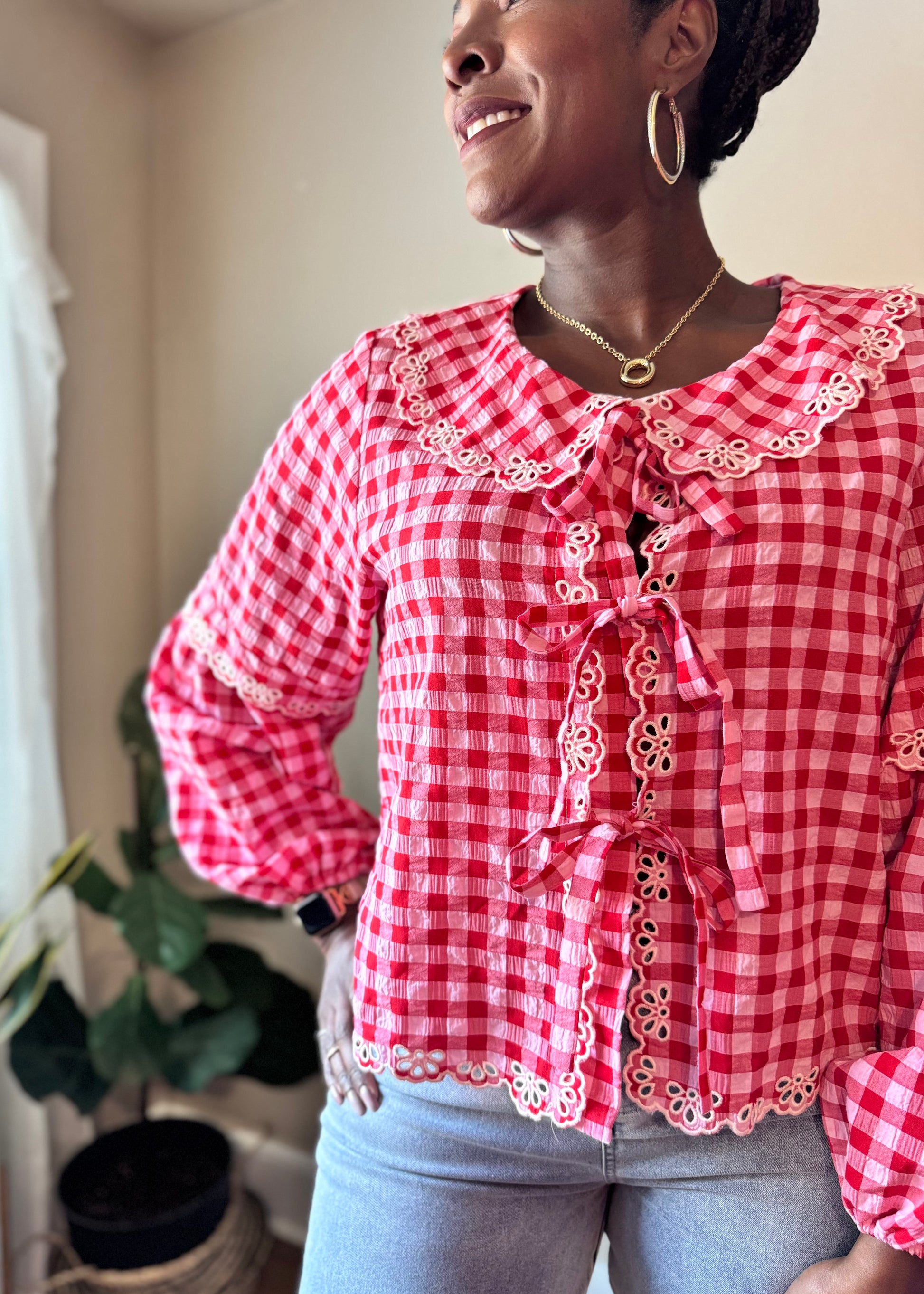 The Rosalie Blouse is a charming nod to classic femininity with a modern, wearable feel. Designed in a timeless gingham check, this woven blouse features a statement Peter Pan collar trimmed with delicate embroidered eyelet lace. Multiple front bow ties add soft detail, while balloon sleeves and a scalloped hem create gentle movement throughout.