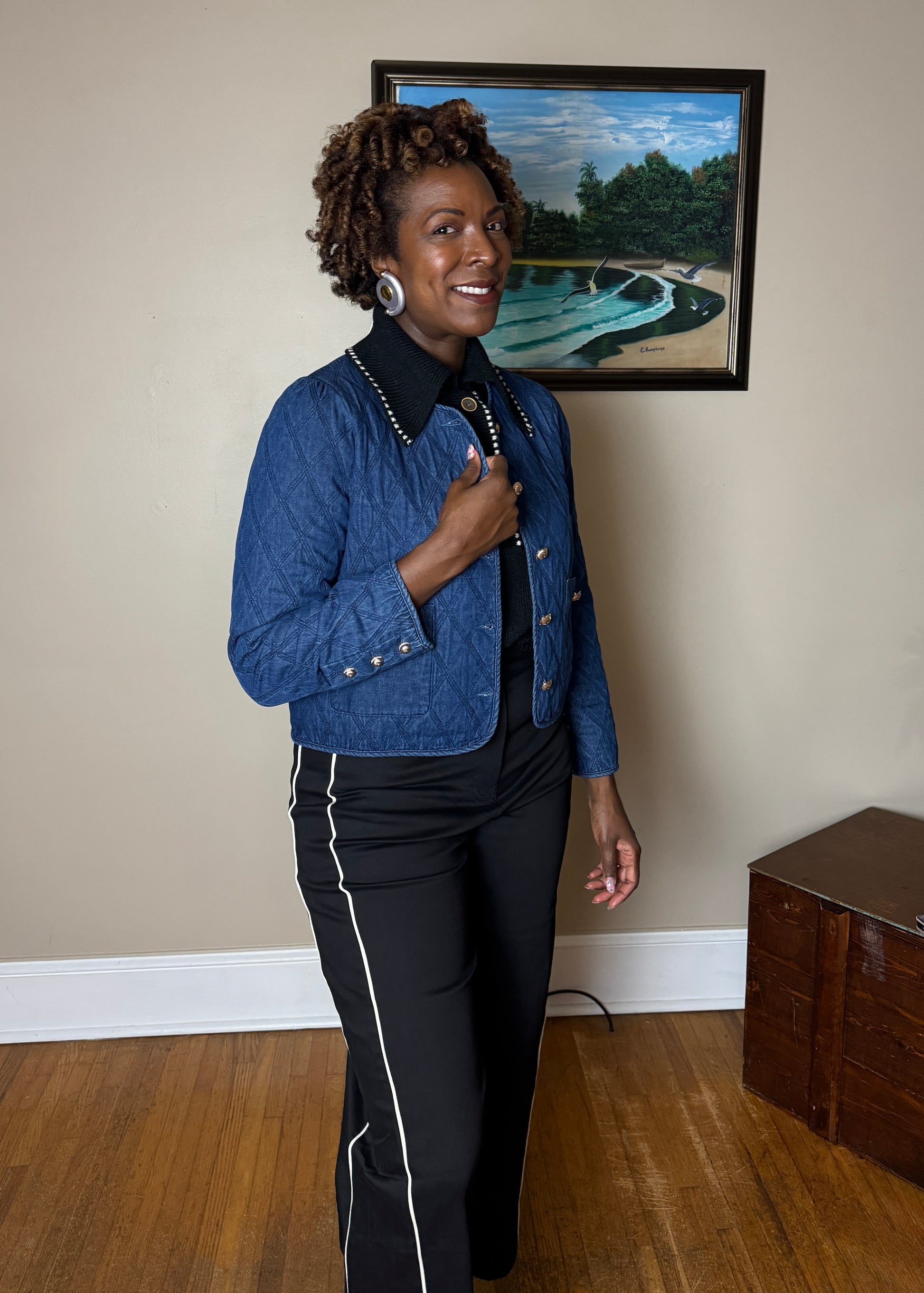 Classic denim gets a chic upgrade in the Austin Quilted Denim Collarless Jacket. Featuring a diamond-quilted texture, antique-style gold buttons, and a clean collarless neckline, this jacket is the perfect balance of casual and polished. Functional front pockets and structured sleeves with button cuffs add utility and style, while the midweight denim makes it a versatile layering piece for fall.