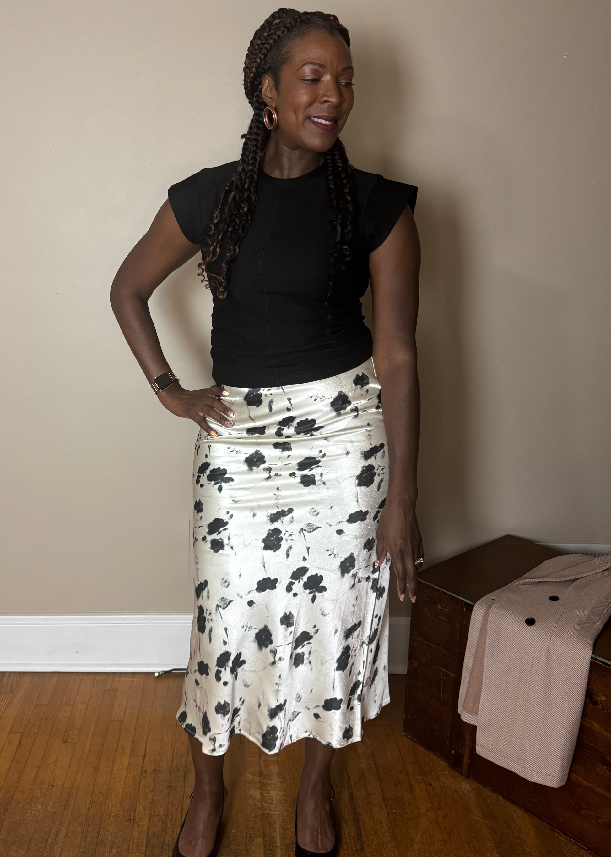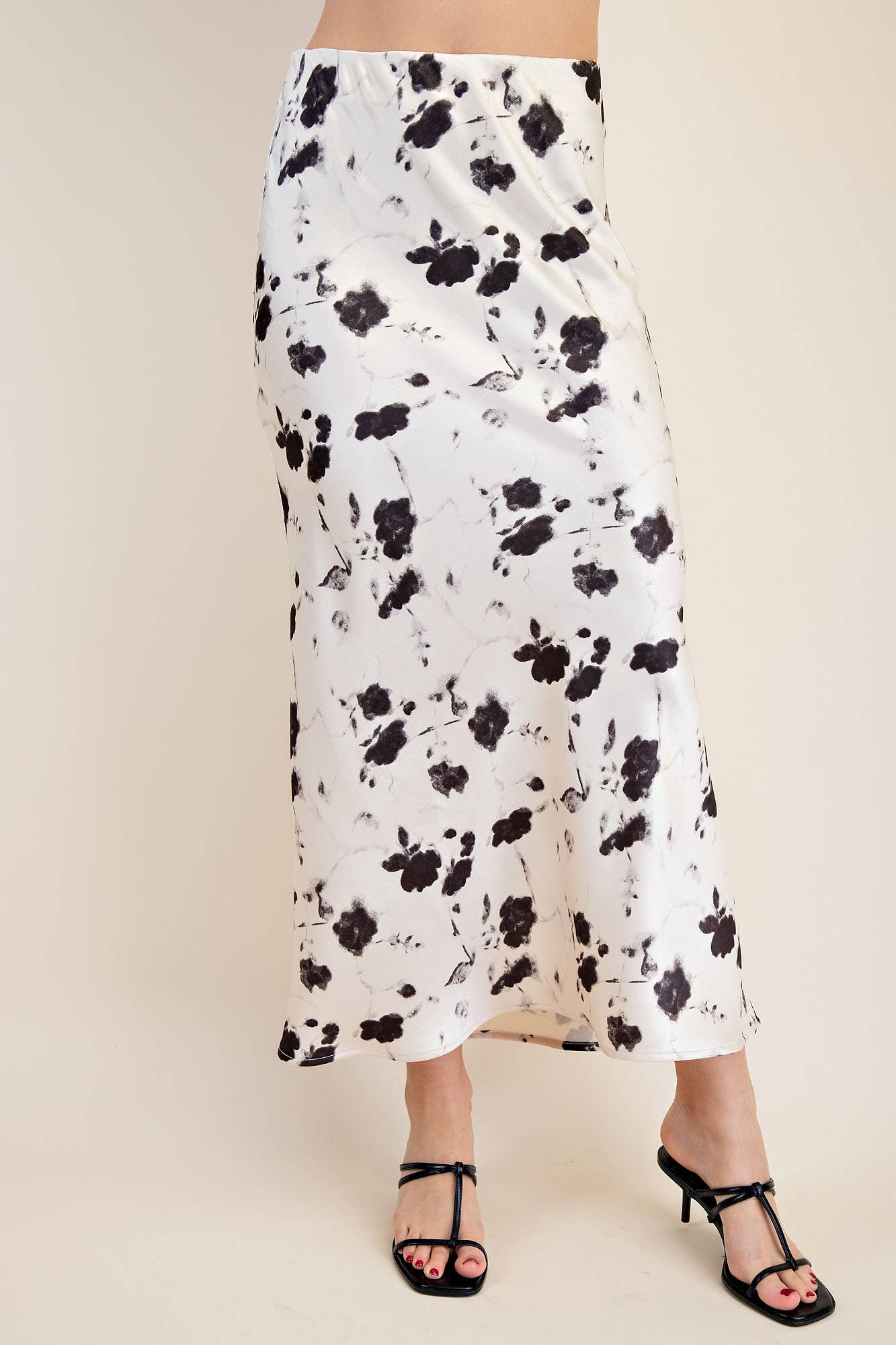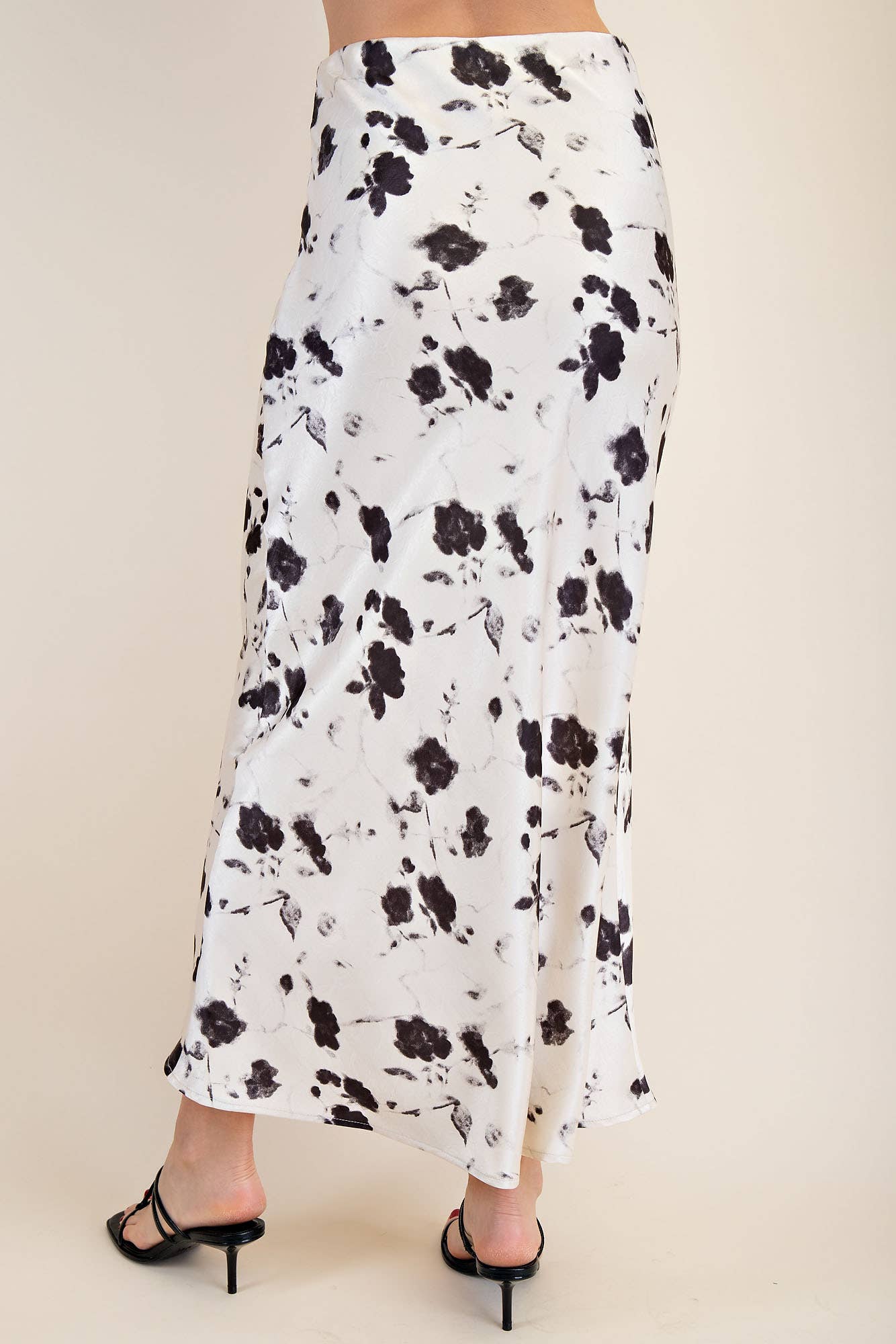 Effortlessly elegant, the Dina Floral Satin Bias-Cut Skirt skims your figure with a soft, feminine drape. The monochrome floral print adds a modern edge to a timeless silhouette, while the bias cut ensures fluid movement and a flattering fit through the hips. Crafted in a silky satin finish, it’s perfect for pairing with fitted tops, chunky knits, or a tailored blazer for day-to-night style.