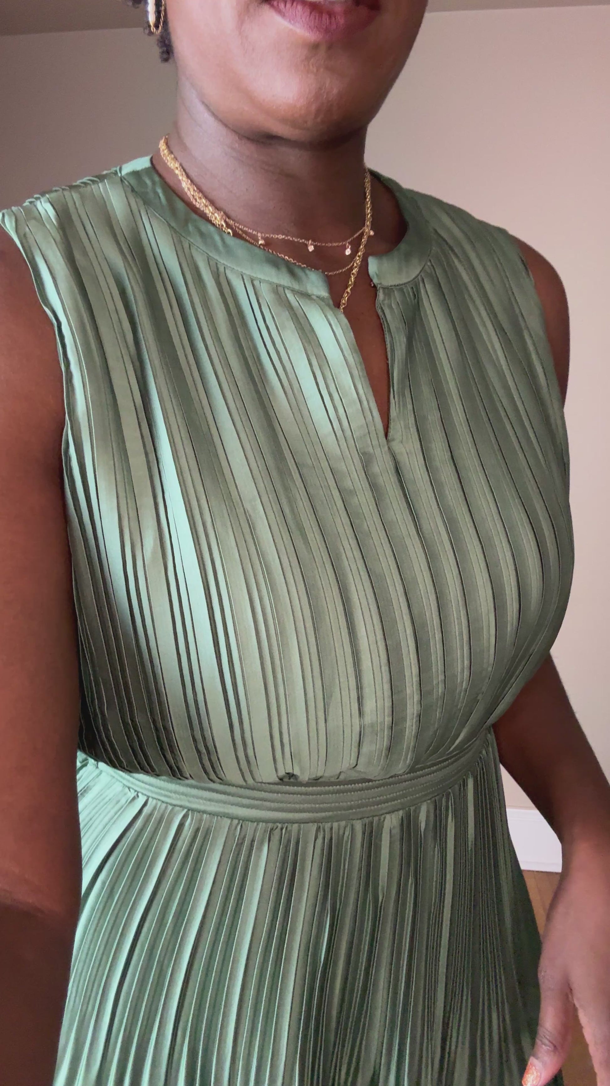 The Bethany Pleated Midi Dress is effortlessly elegant in a rich green hue. Its sleeveless design and high neckline offer a refined touch, while delicate pleating and a cinched waist create a flattering, flowy silhouette. Perfect for brunch, special occasions, or everyday sophistication, this dress pairs beautifully with heels or sandals.