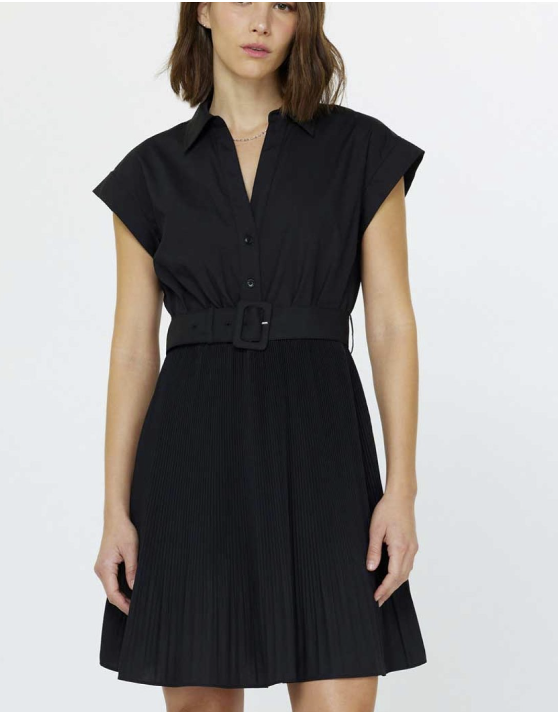 The Betsey Marie Short Dress blends timeless tailoring with feminine flair. Designed with a classic shirt collar, split neckline, and button-down front, this short sleeve midi dress is polished yet effortlessly wearable. The standout detail? A pleated skirt that adds movement and charm, along with a buckle belt to cinch the waist and flatter your shape.