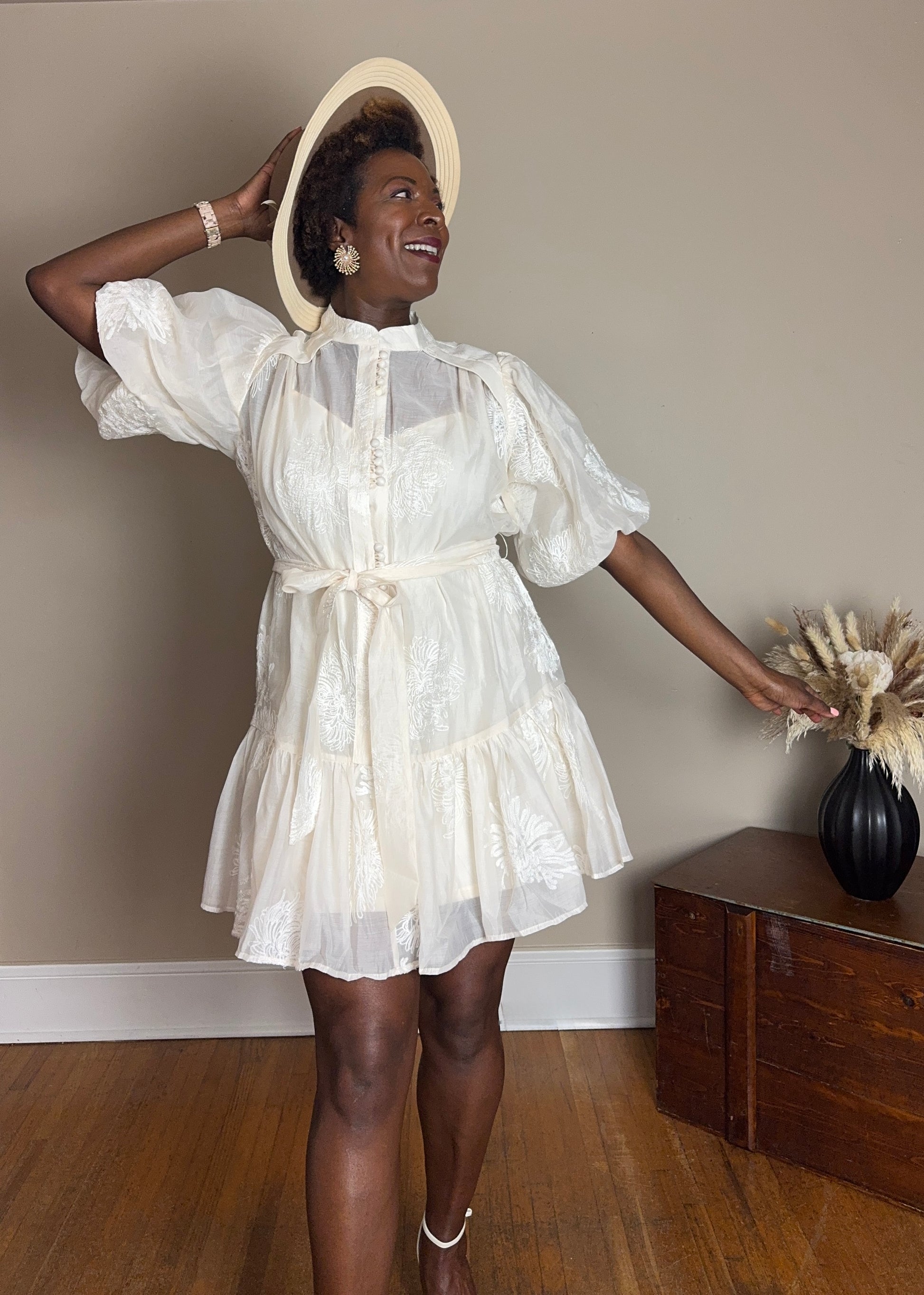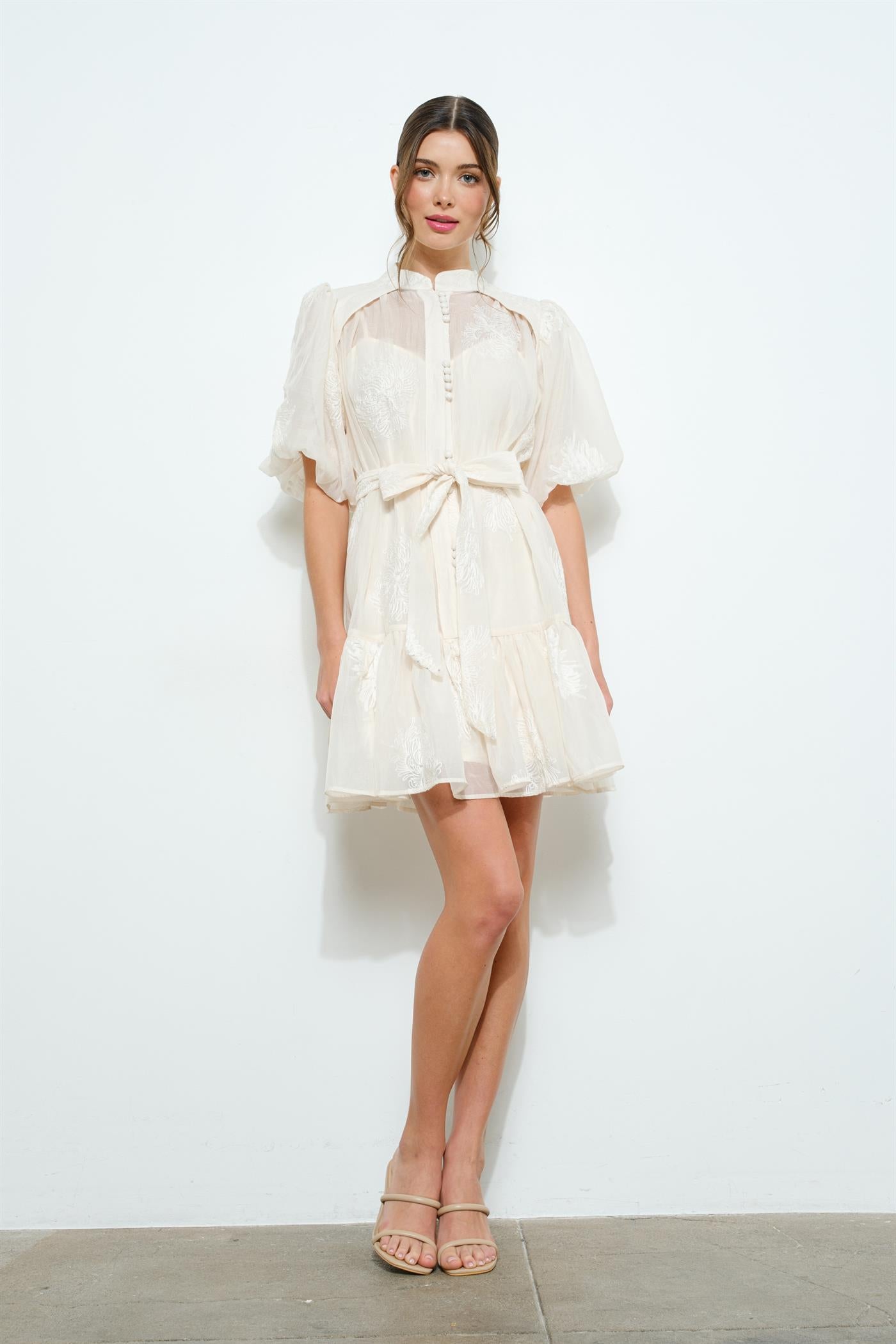 Romantic, refined, and effortlessly chic — the Briana dress is a dream in delicate embroidery. This ivory bubble dress features sheer puff sleeves, a high neckline with covered button details, and a soft tie-waist belt that flatters your shape. The tiered skirt and subtle bubble hem give it playful volume, while hidden side pockets add a functional touch. Fully lined for comfort and elegance.