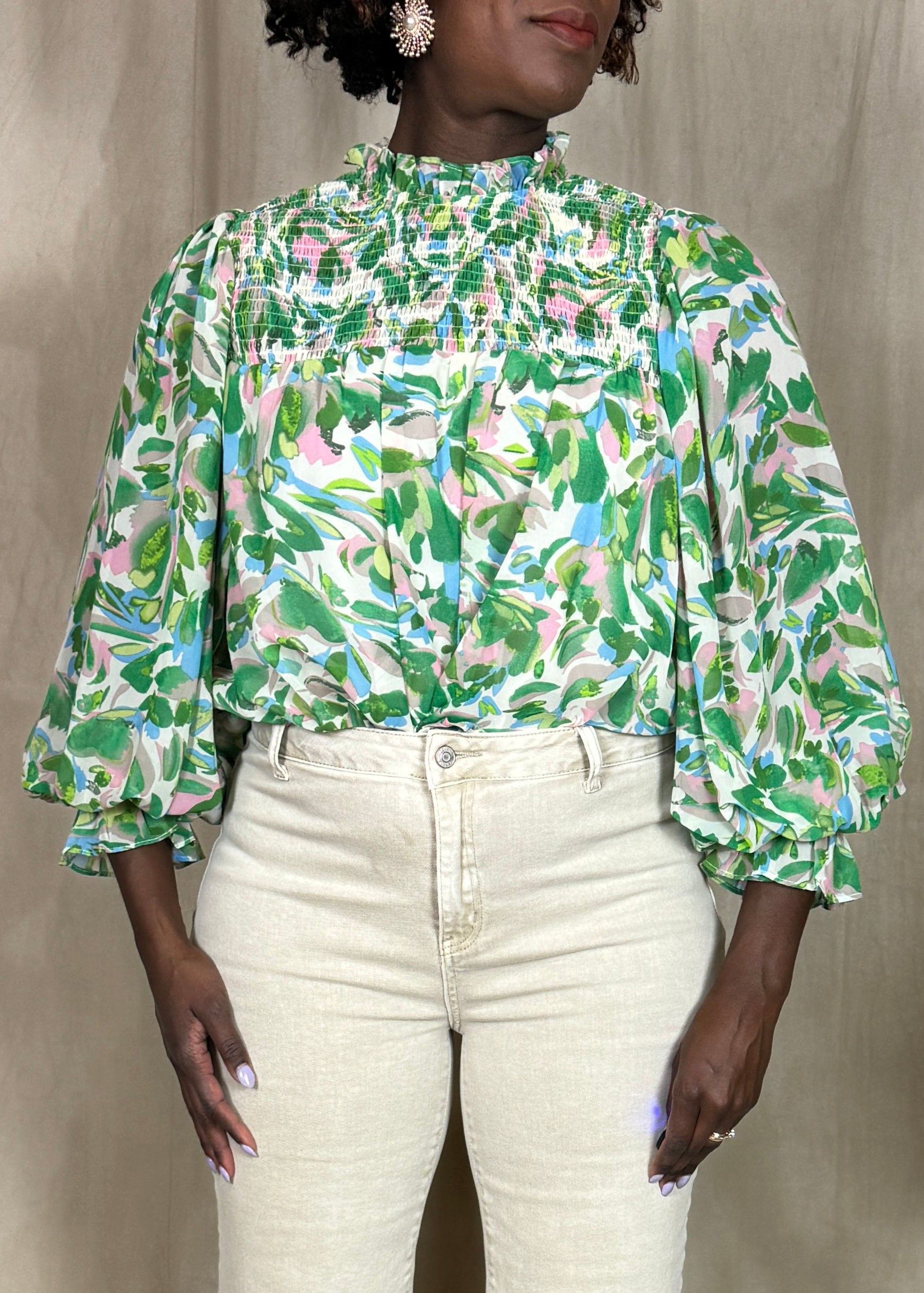 Effortlessly transition into spring and beyond with this eclectic chiffon top. Featuring an elasticized sleeve opening and smocked front yoke, it's the perfect piece to pair with high-waisted jeans or a pencil skirt.