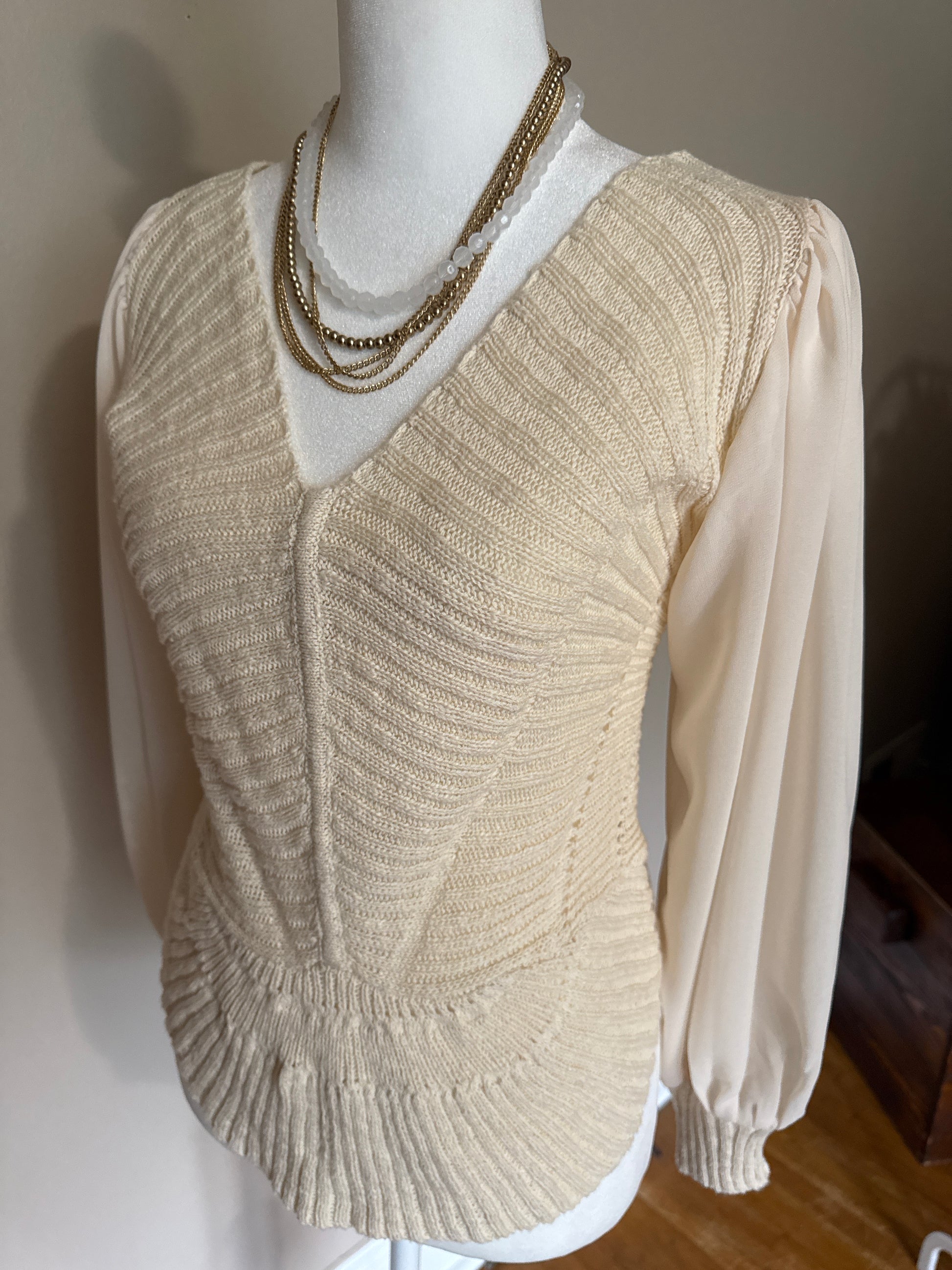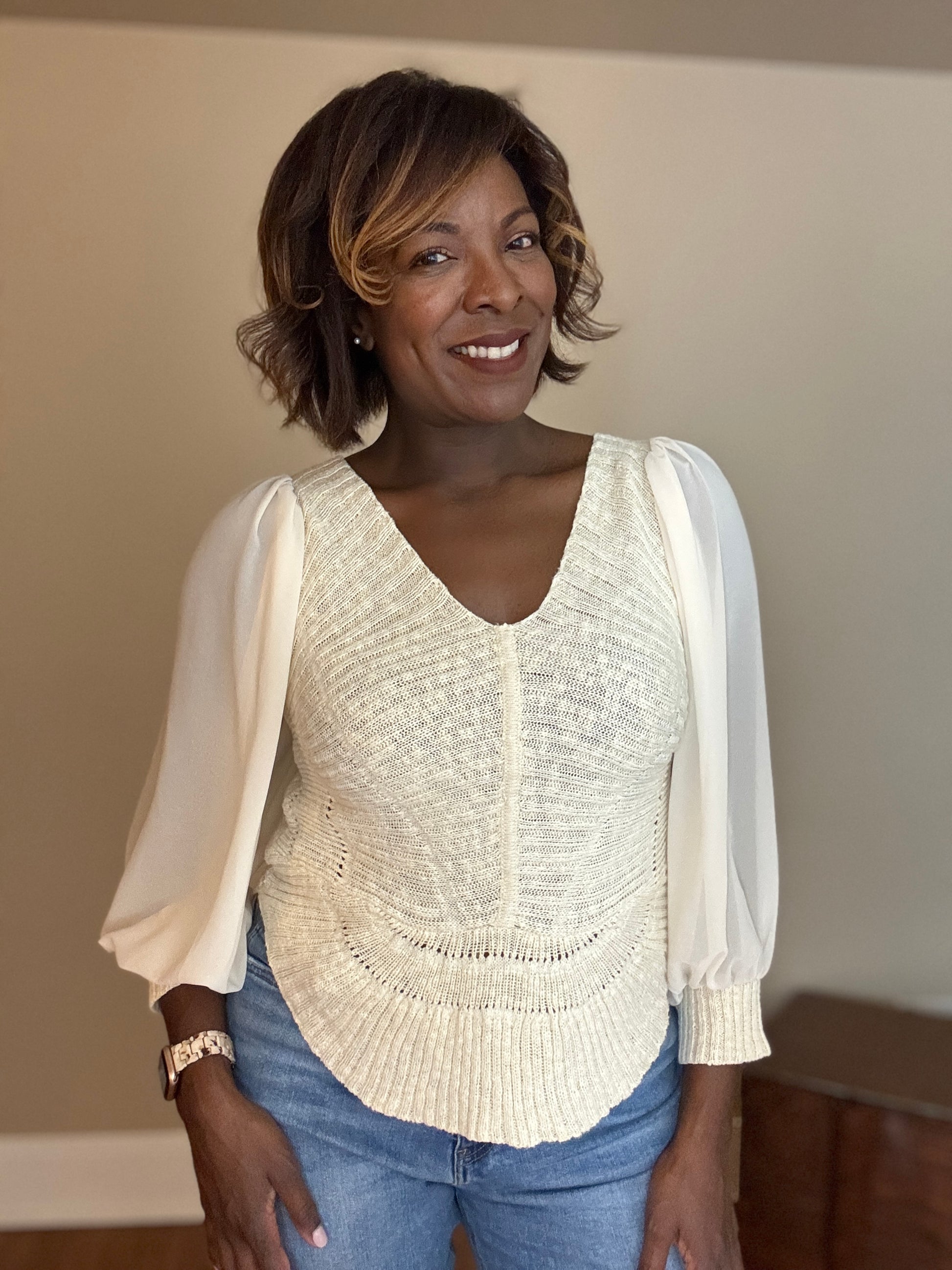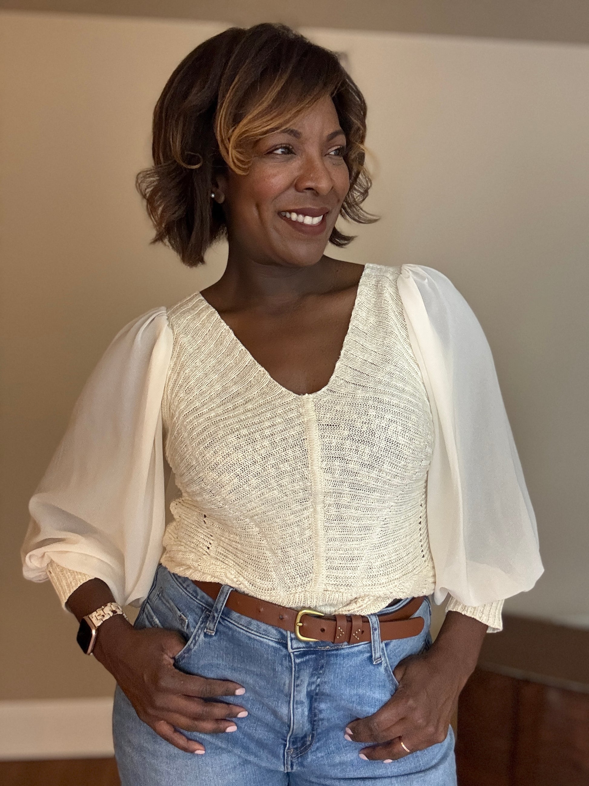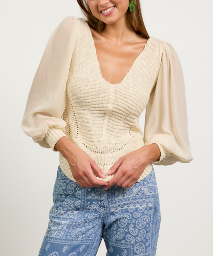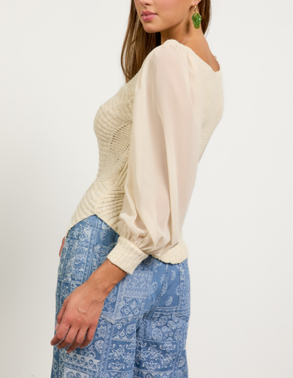 The Camille Top is the perfect balance of elegance and drama. Designed in a soft cream hue, this top features a flattering ribbed knit bodice that contours beautifully to your shape, while sheer, billowing bishop sleeves add a touch of romance. The deep V-neckline and fitted waist create a feminine silhouette, making it a versatile piece for day or night. Pair it with denim for an elevated casual look or style it with a sleek skirt for a chic evening outfit.