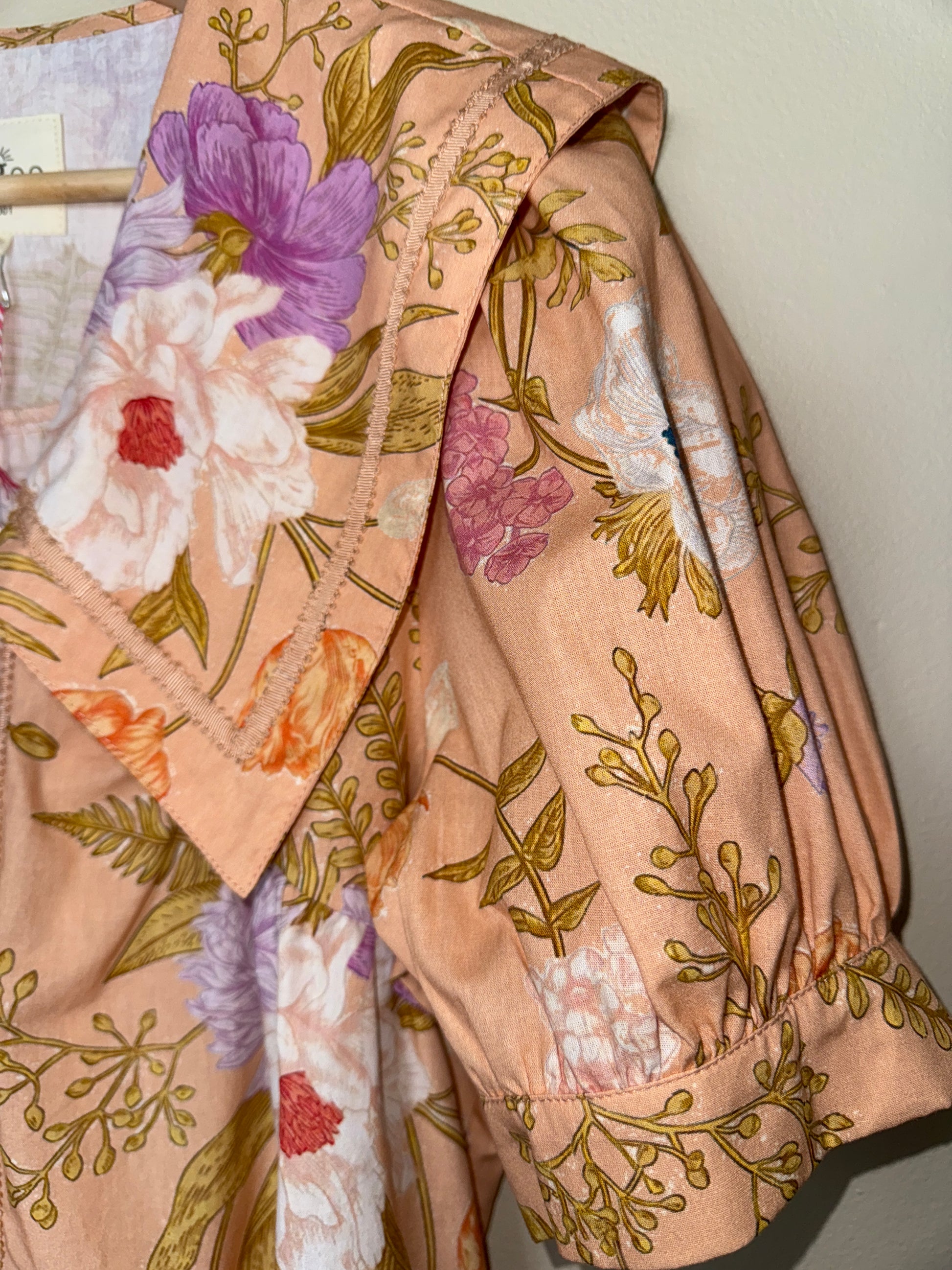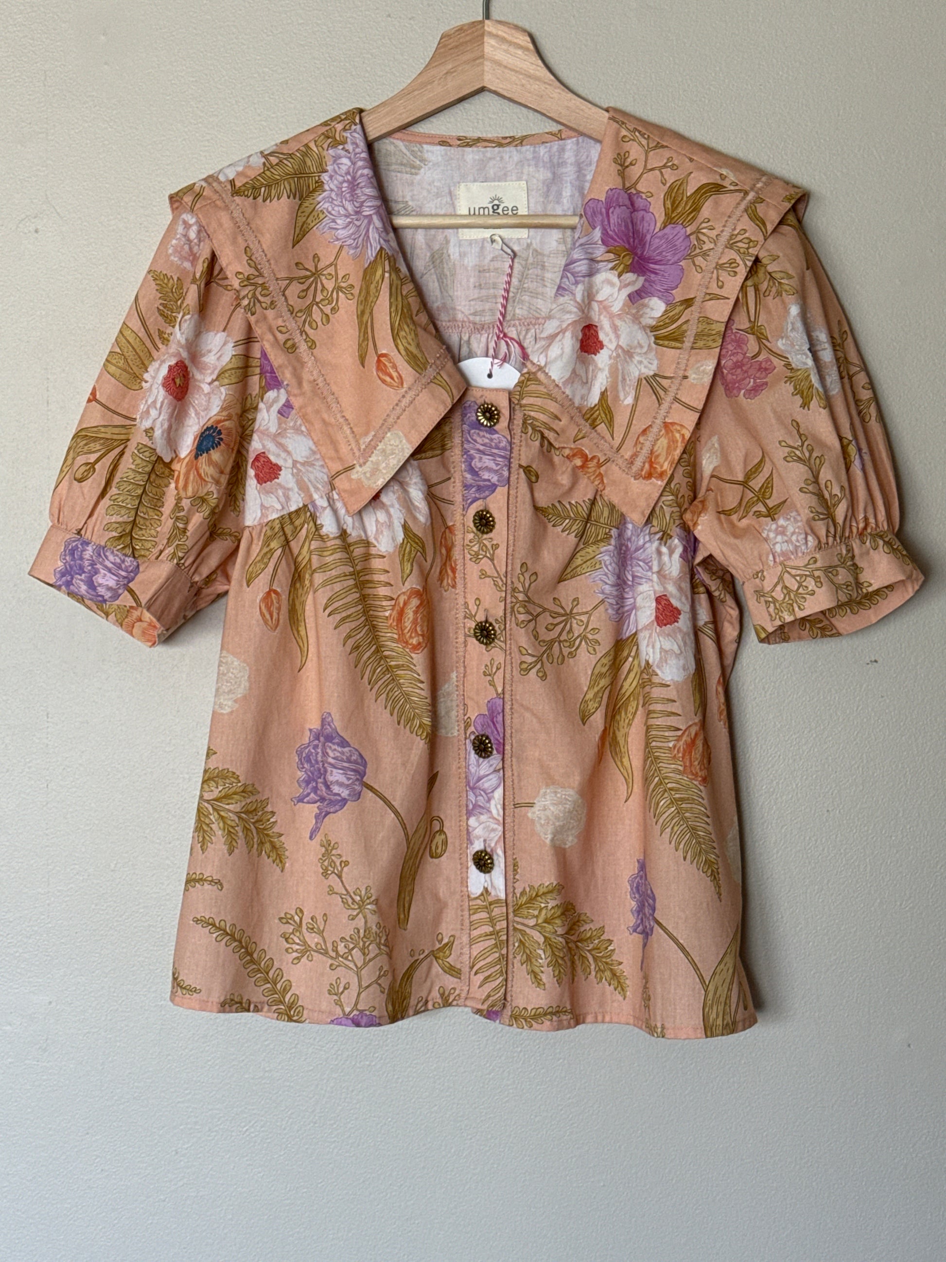 The standout detail? An oversized statement collar with delicate edging that adds a vintage-inspired twist. Puff sleeves with subtle gathers give it a soft, romantic silhouette, while the wooden-style buttons down the front add a natural, earthy touch.