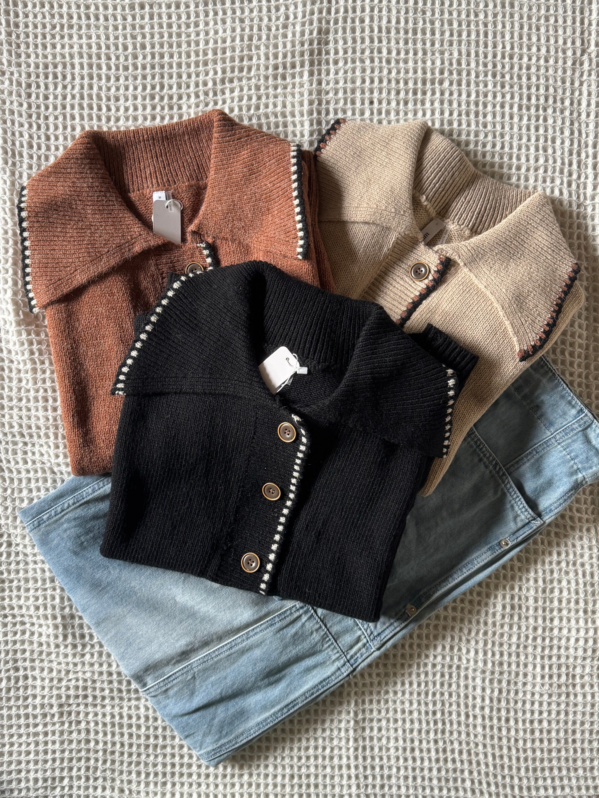 Details: Knit fabric, pointed collar, button-front placket, contrast trim at collar and sleeves