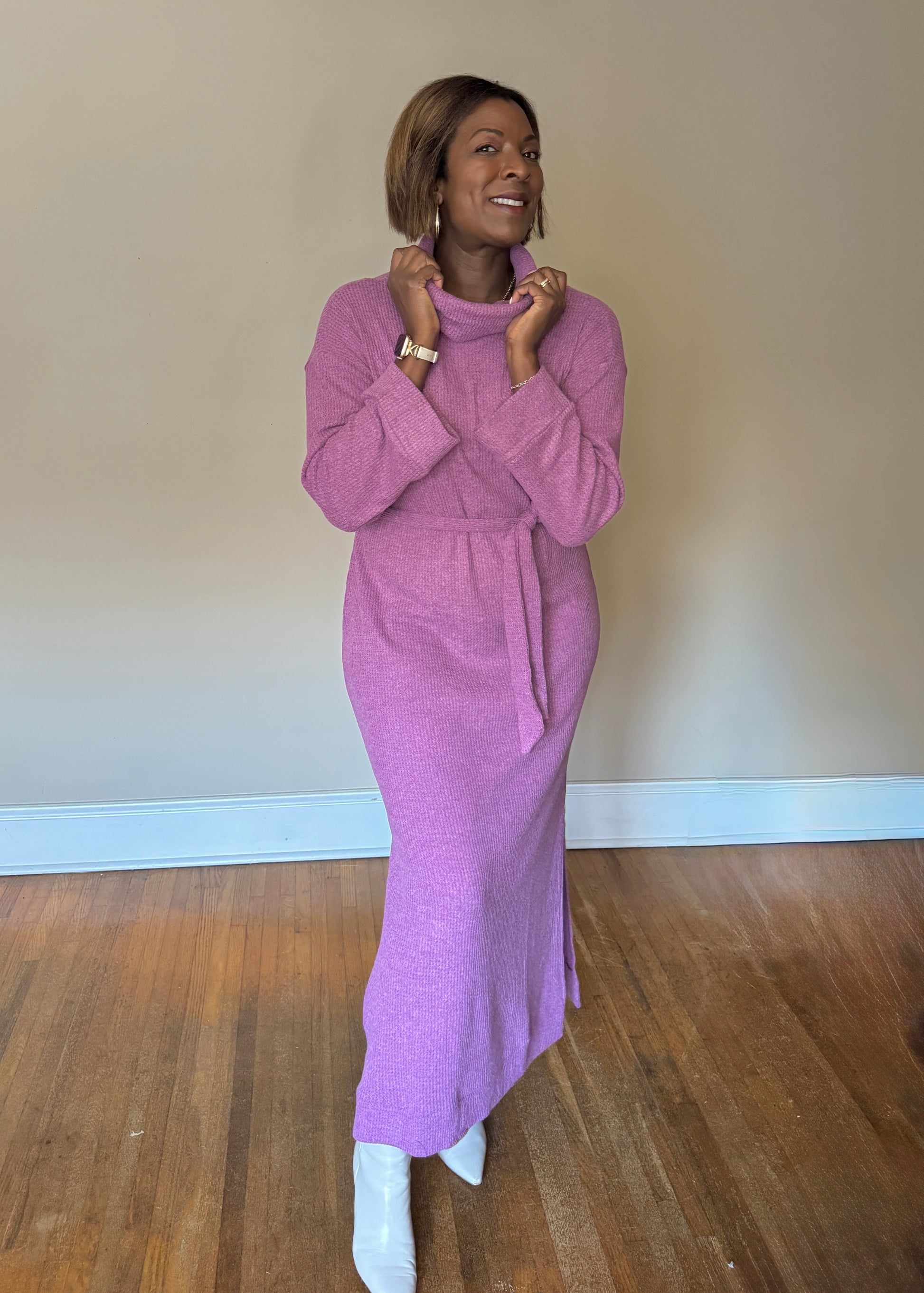 The Lisette is a brushed thermal knit maxi dress designed to feel soft and warm, yet look beautifully put-together. The relaxed cowl neckline, optional waist tie, and fluid side slits create movement without bulk — the kind of silhouette that flatters without trying.