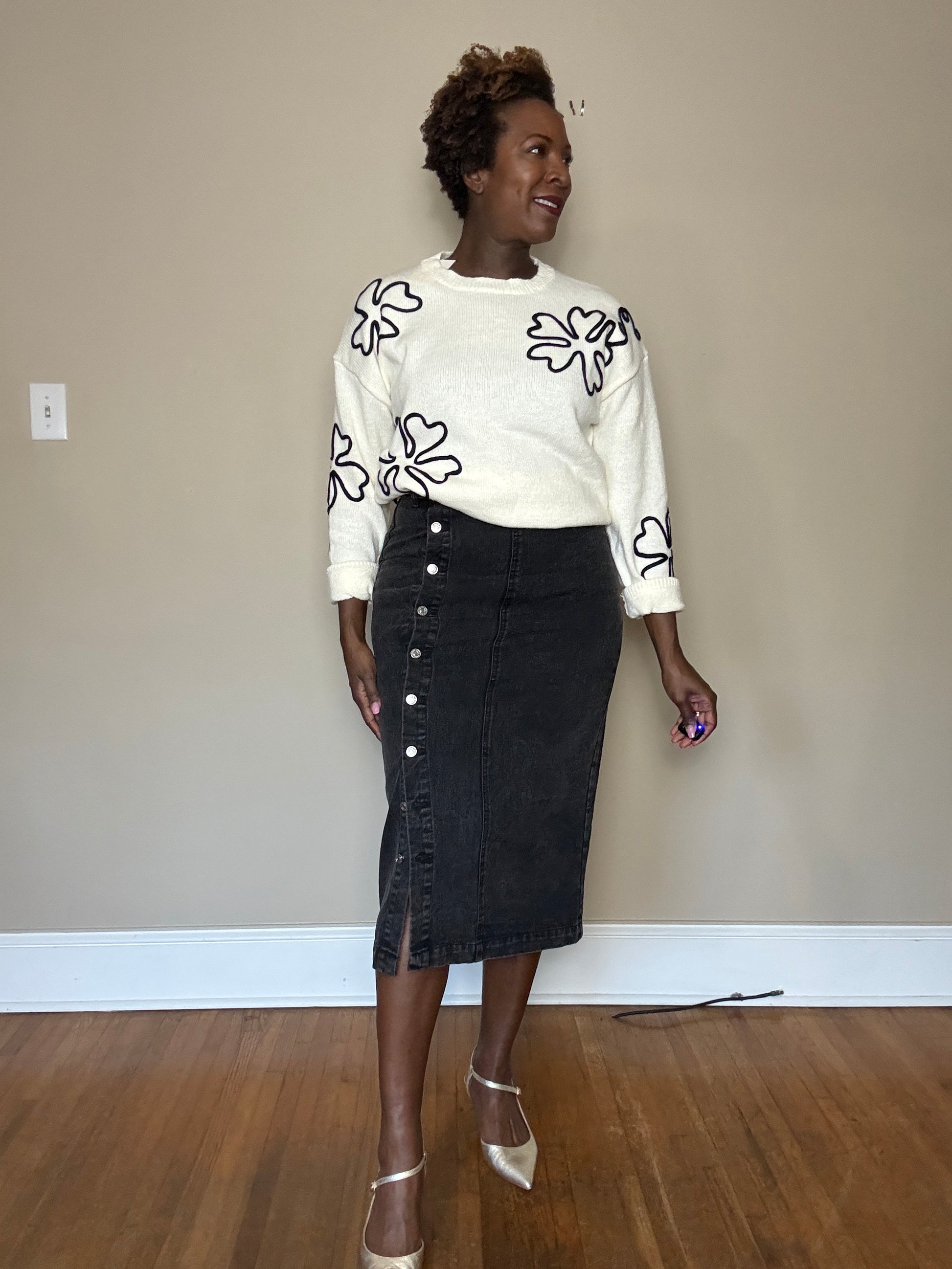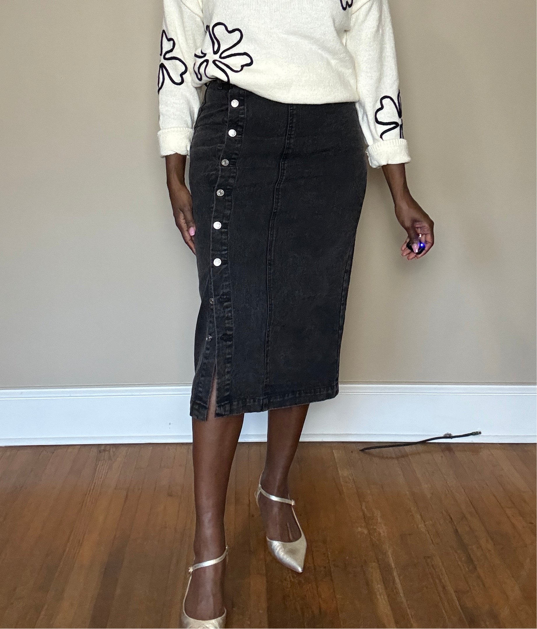 Expertly crafted for both style and comfort, this midi pencil skirt boasts side buttons that add a touch of sophistication while providing a flattering fit for all body types.