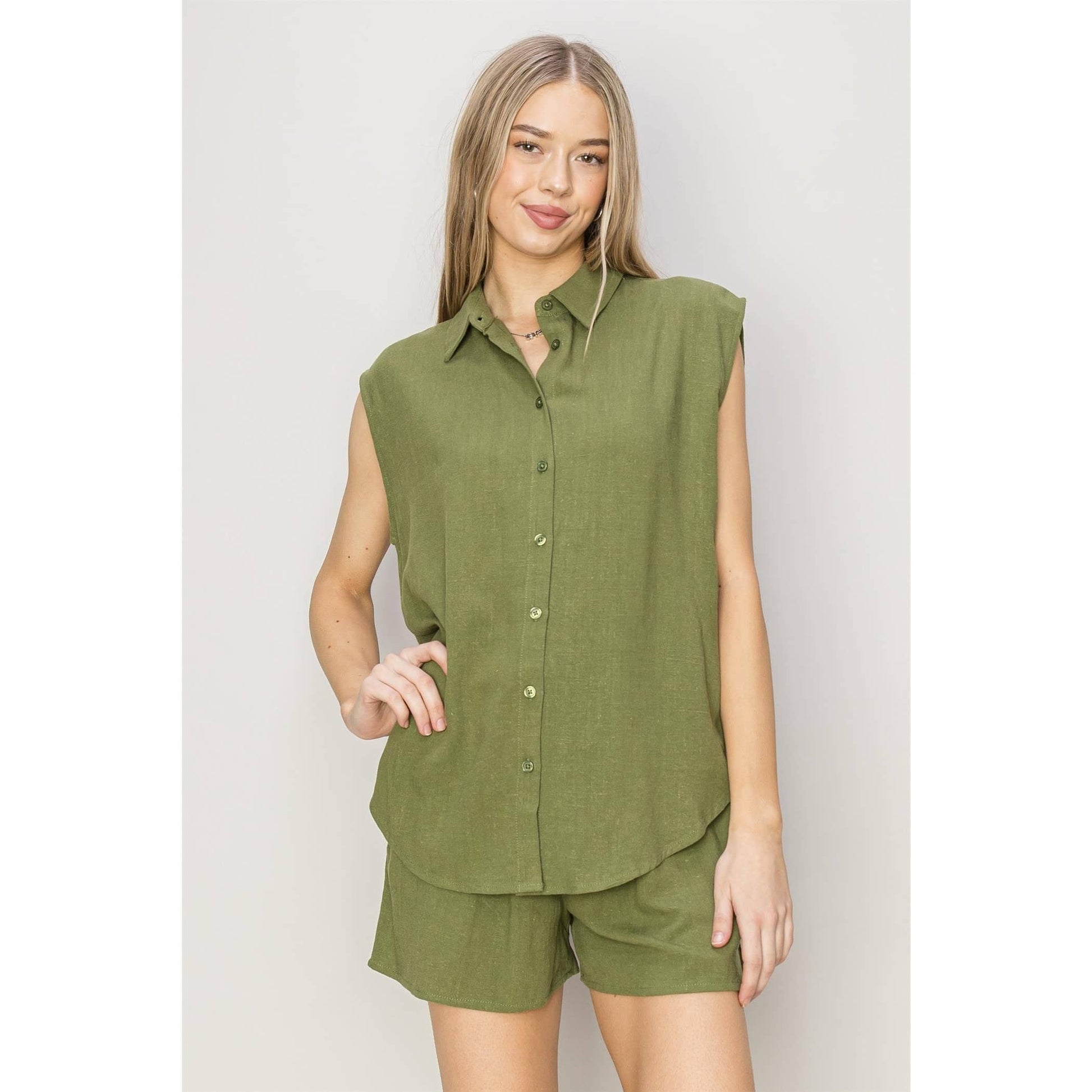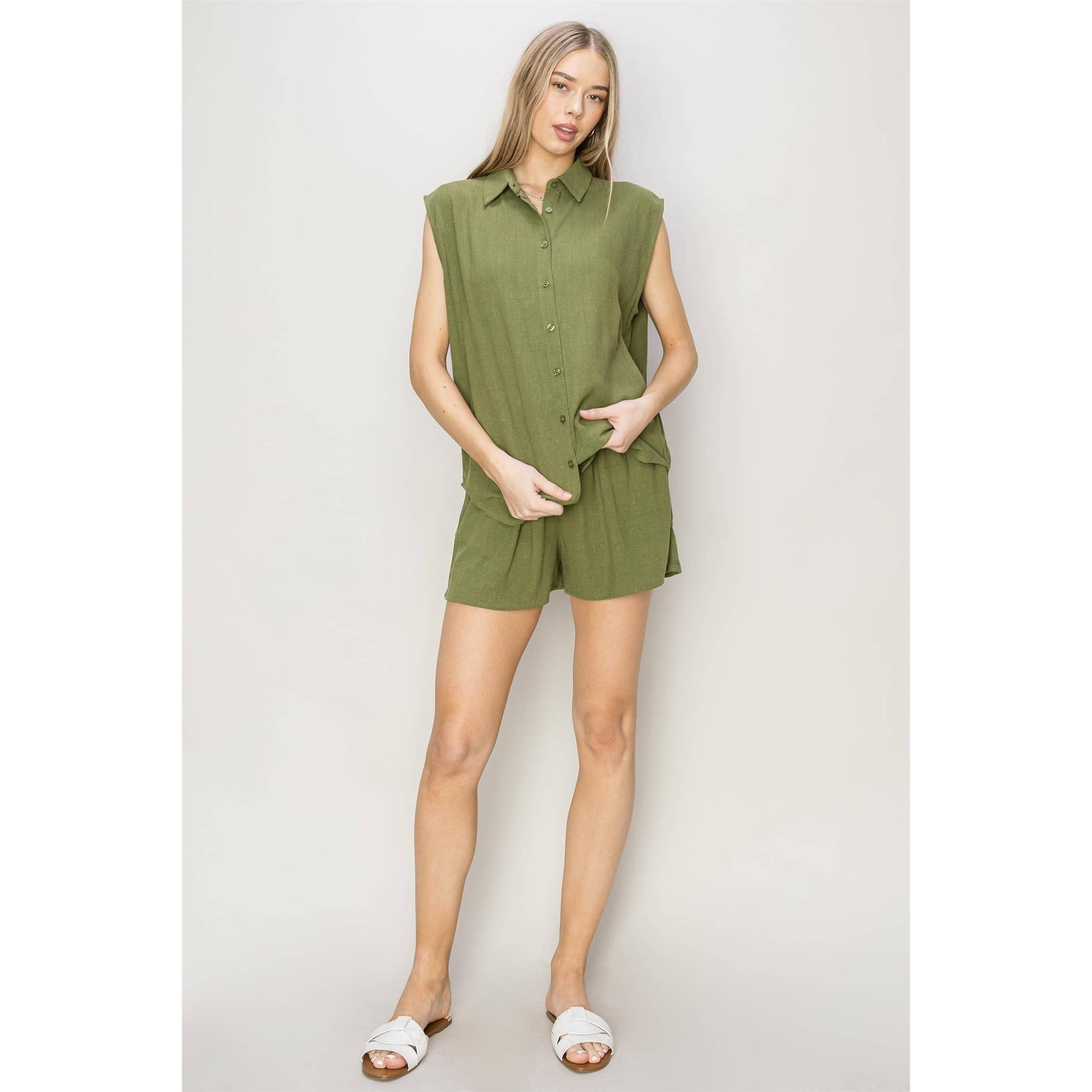 This stylish linen set is a spring and summer must-have! The breathable button-up shirt features a classic collar, cap sleeves, and a relaxed fit, while the high-waisted shorts add a touch of casual charm with a drawstring closure and convenient side pockets.