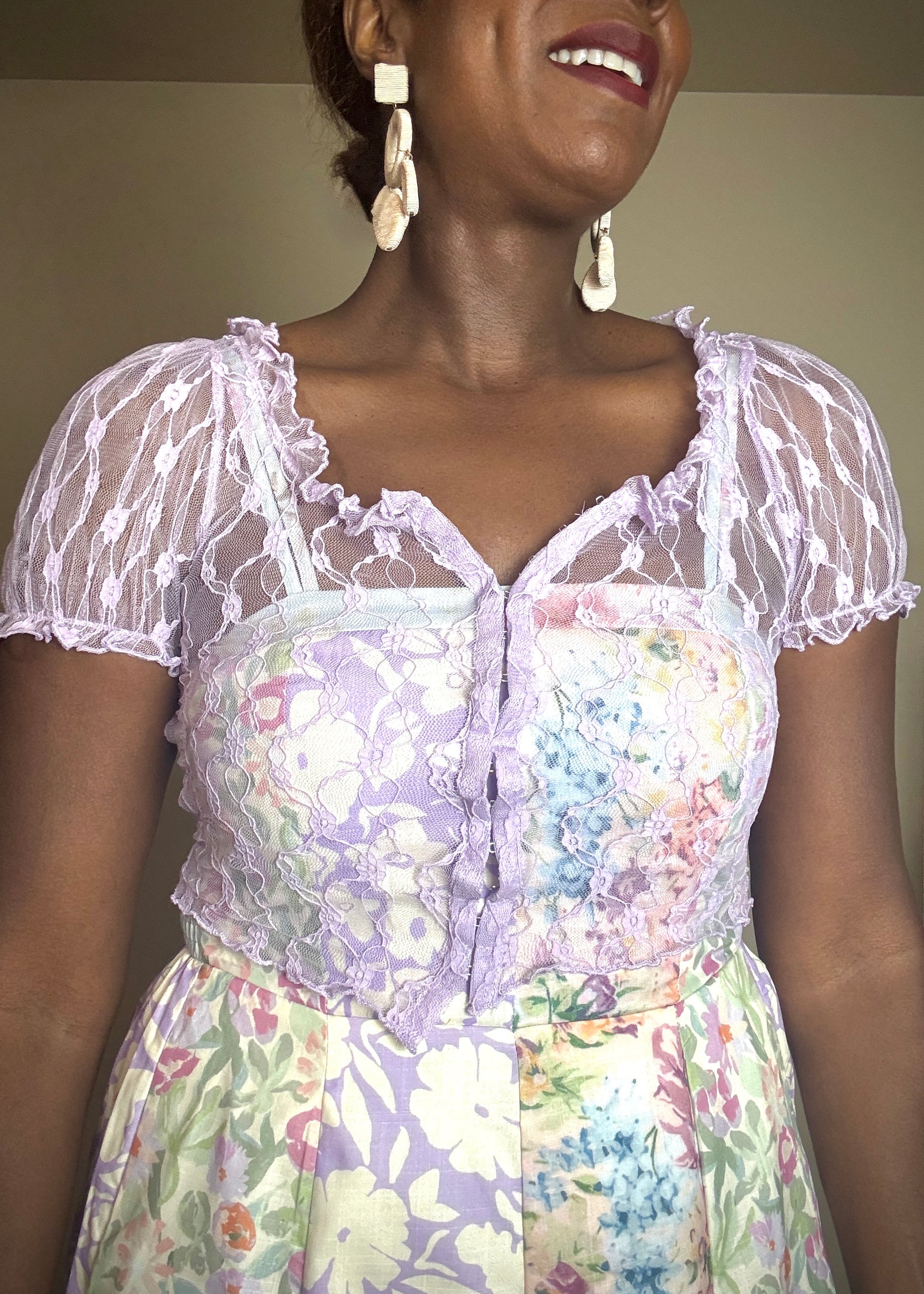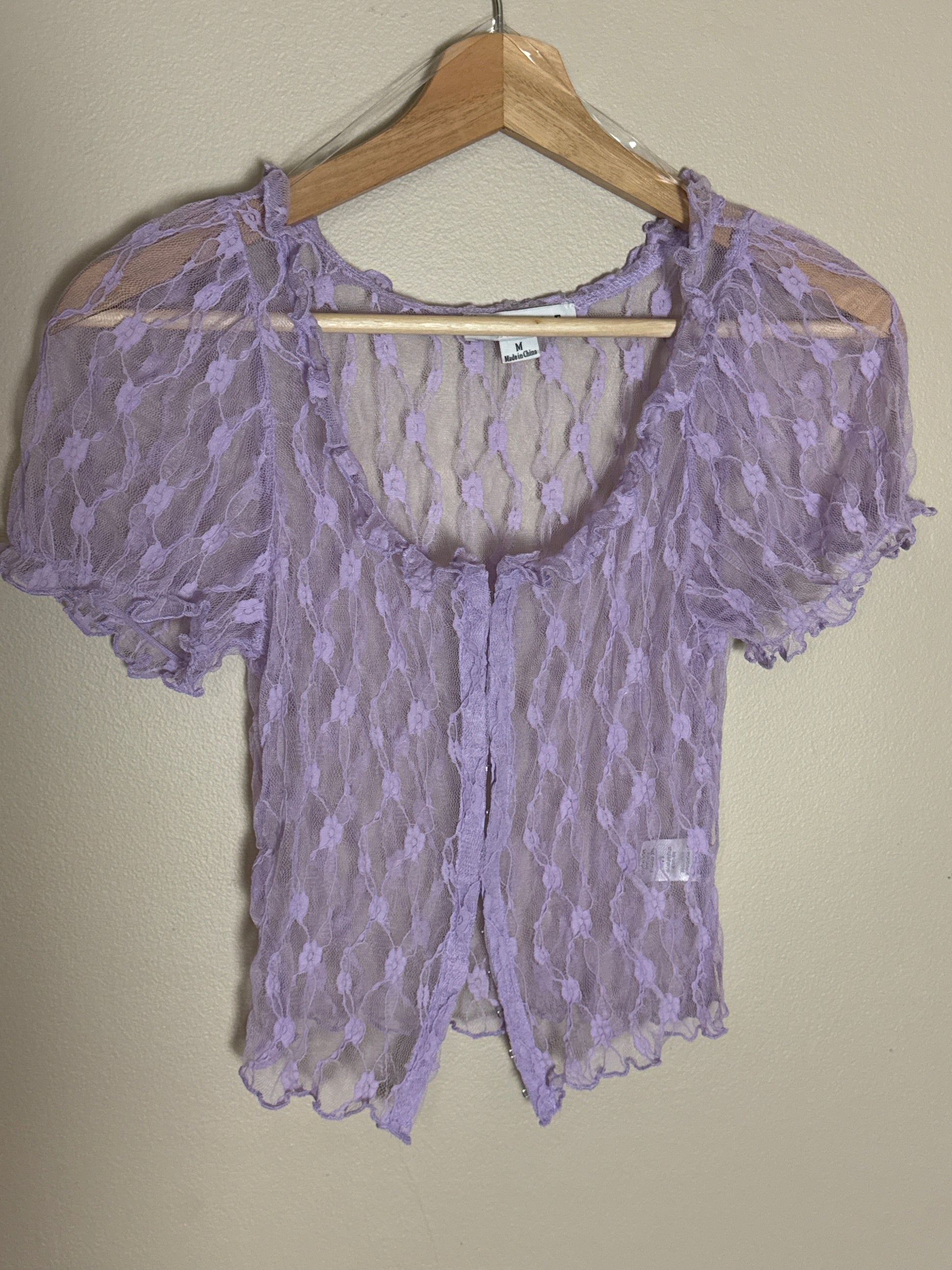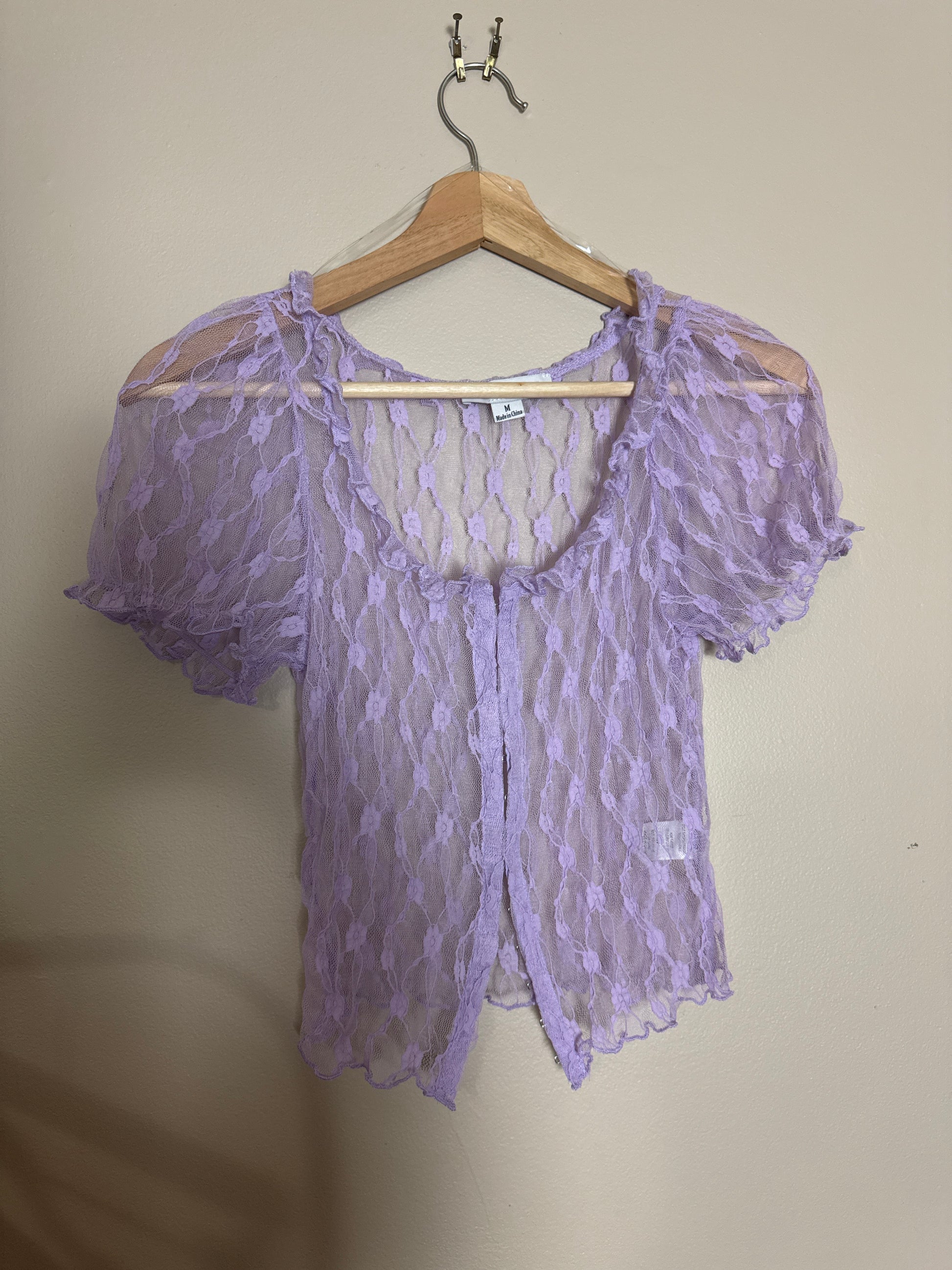Sheer Lace Cropped Cardigan Top – Puffed Sleeve Button-Up