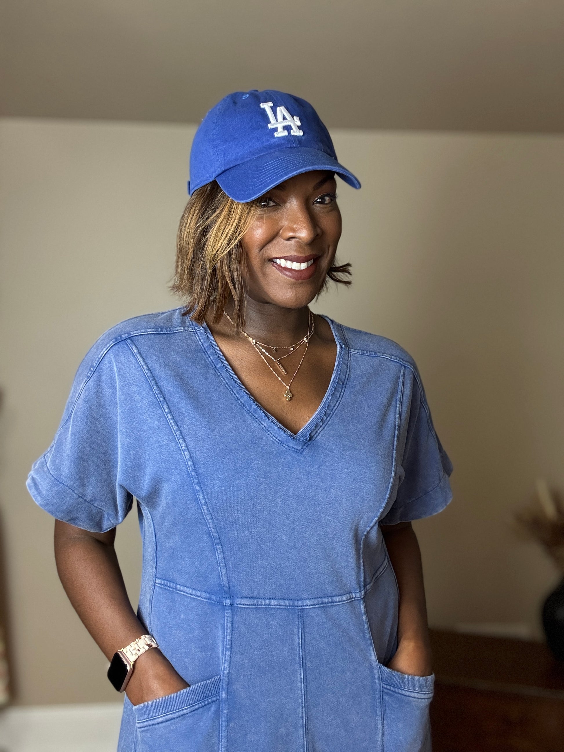 Step into effortless style with our V-Neck Mineral Wash Jumpsuit in a soft denim hue. This casual yet elevated one-piece is made from cozy French Terry fabric, perfect for all-day comfort. The rib contrast along the neckline and sleeves adds a touch of texture, while the flattering V-neckline elongates your silhouette.