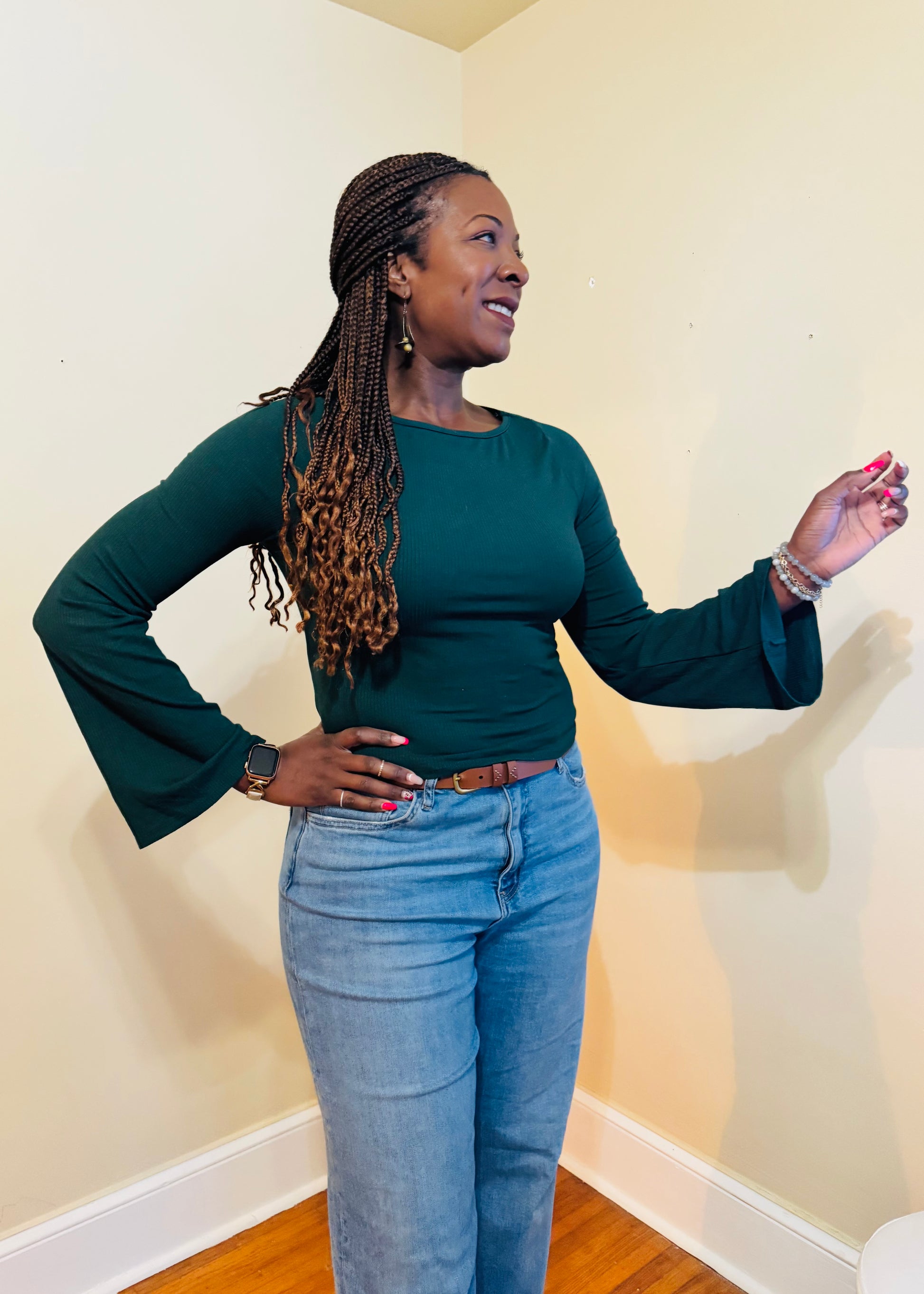 The boat neckline frames the collarbone beautifully, while subtle bell sleeves add a whisper of drama. Whether you’re layering it under a blazer for the office or pairing it with denim and boots for weekend errands, Everly transitions effortlessly from day to night with elevated ease.