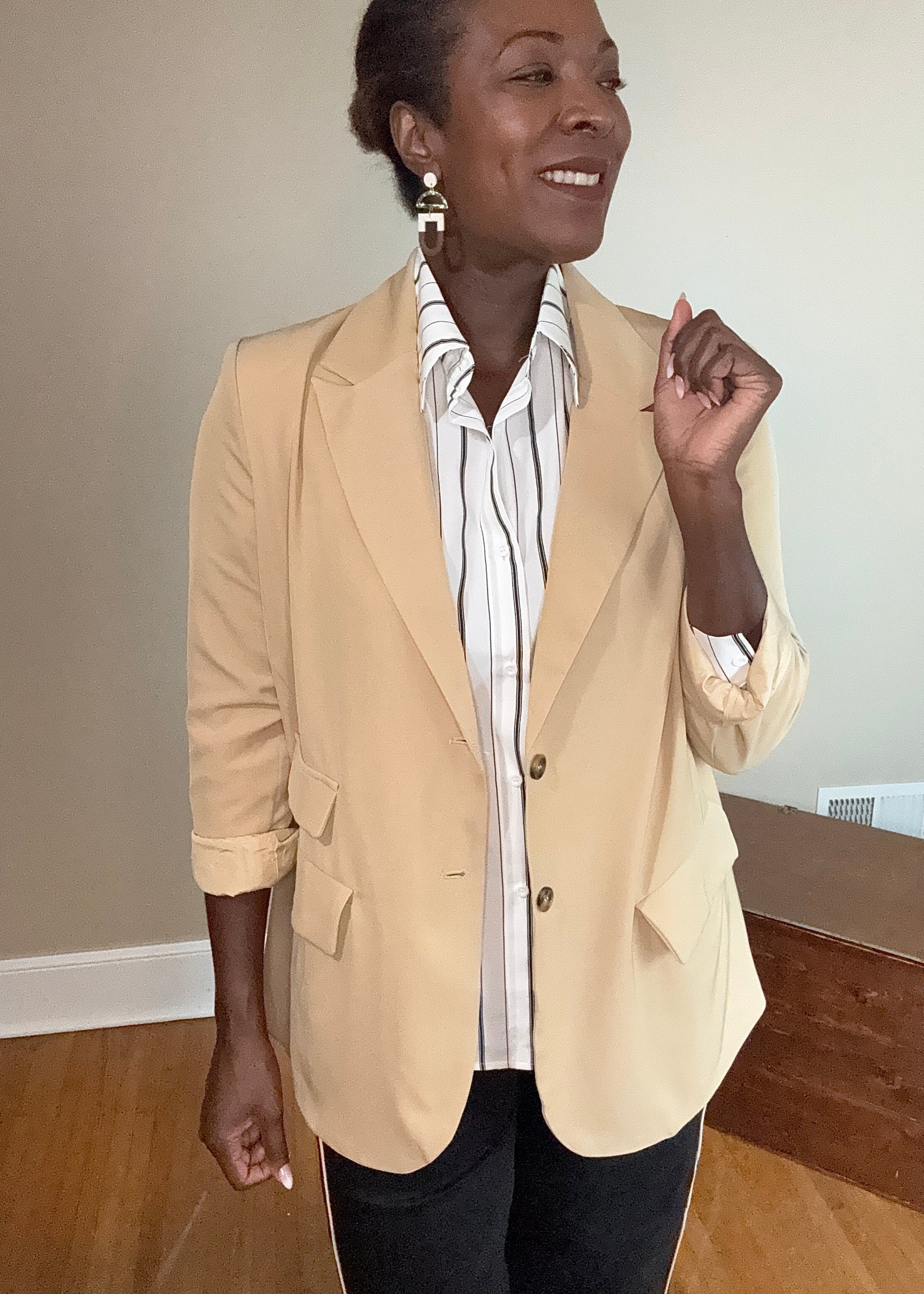 Details: Notched lapel, flap pockets, single-button closure, long sleeves