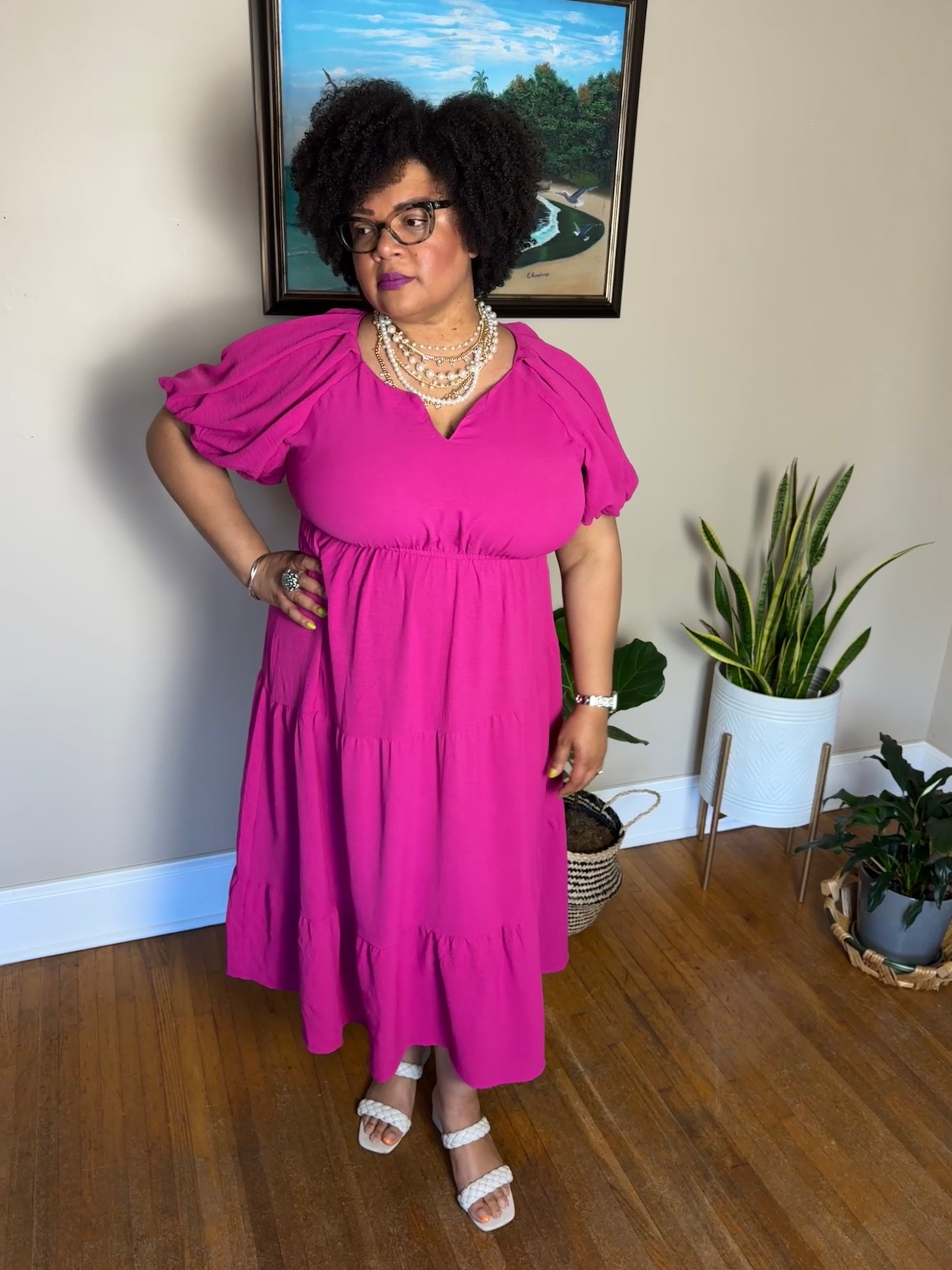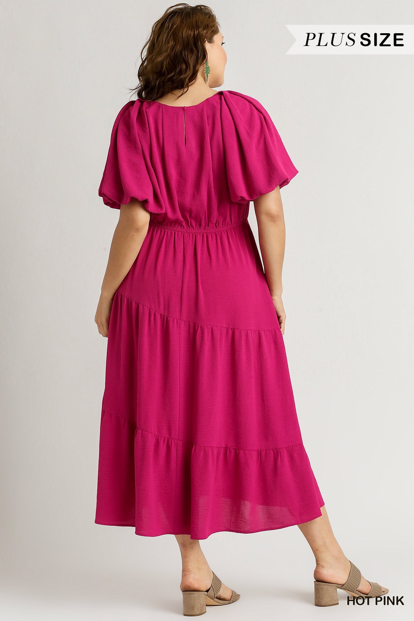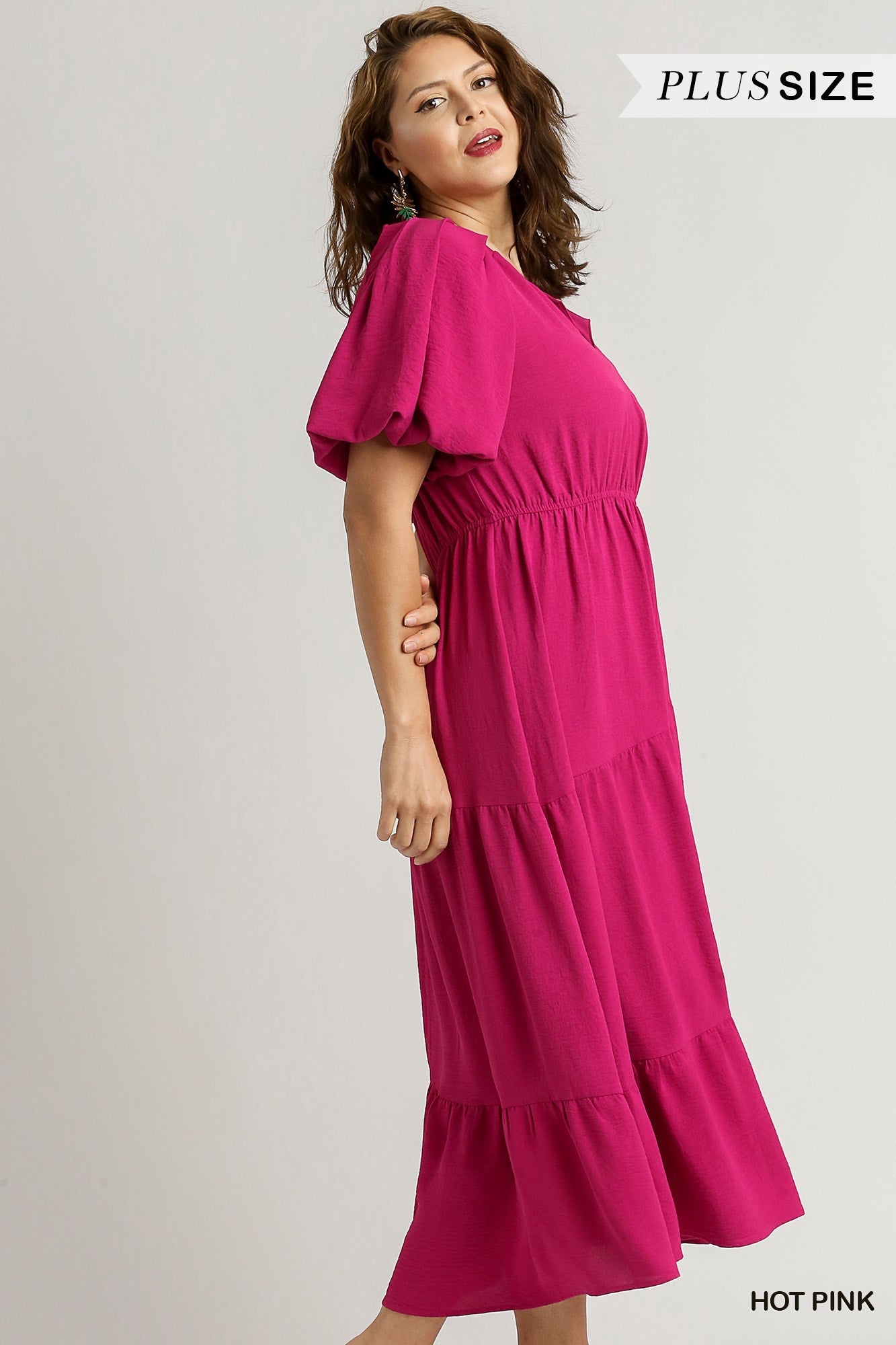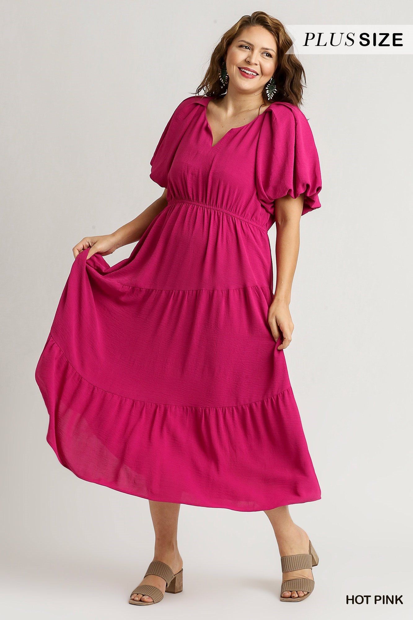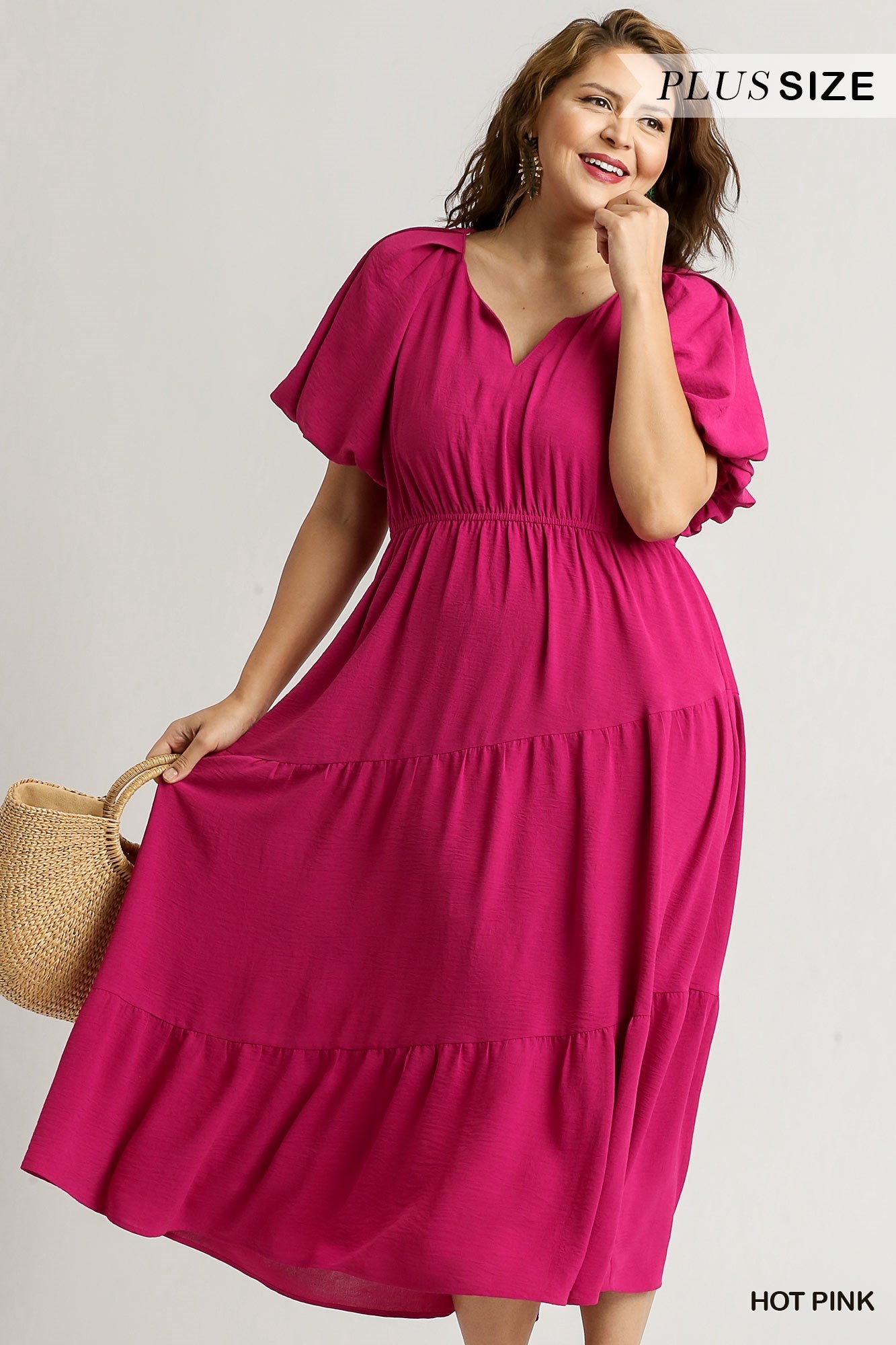 Get ready to turn heads in this Solid Split Neck A-Line Midi Dress! Featuring an Asymmetric seam tiered skirt and pleated detail puff sleeves, this dress is a bold and stylish addition to any wardrobe.