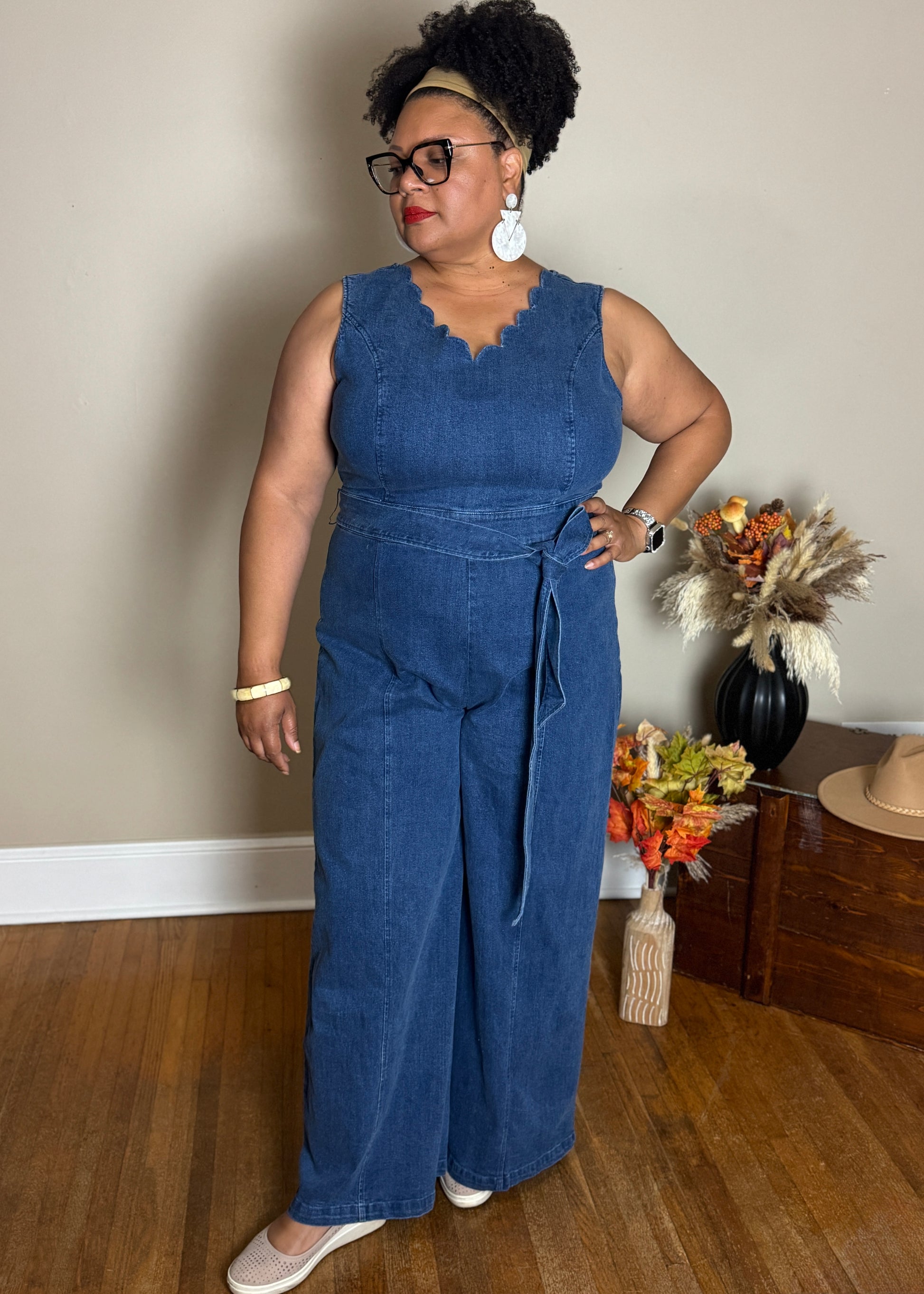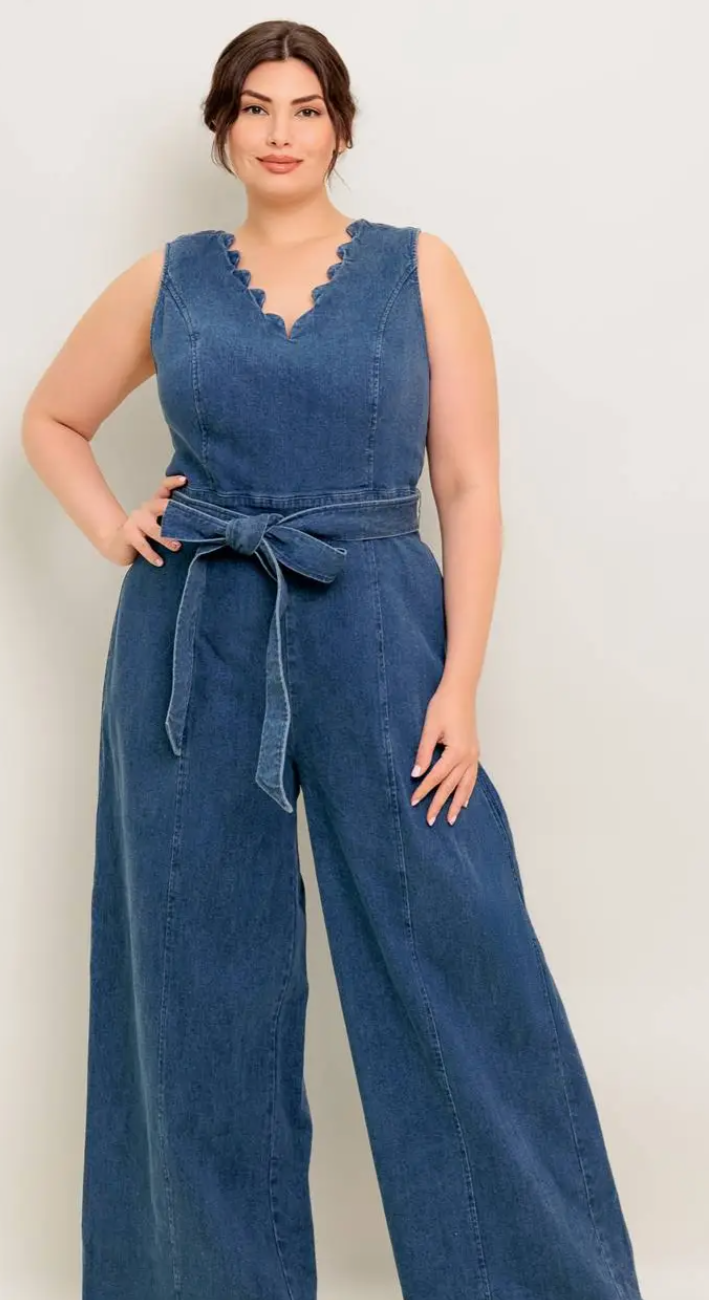 A washed denim jumpsuit featuring scalloped V neckline, sleeveless, self sash belt, wide leg and back zipper closure Details: Self : 99% Cotton 1% Spandex Size & Fit -