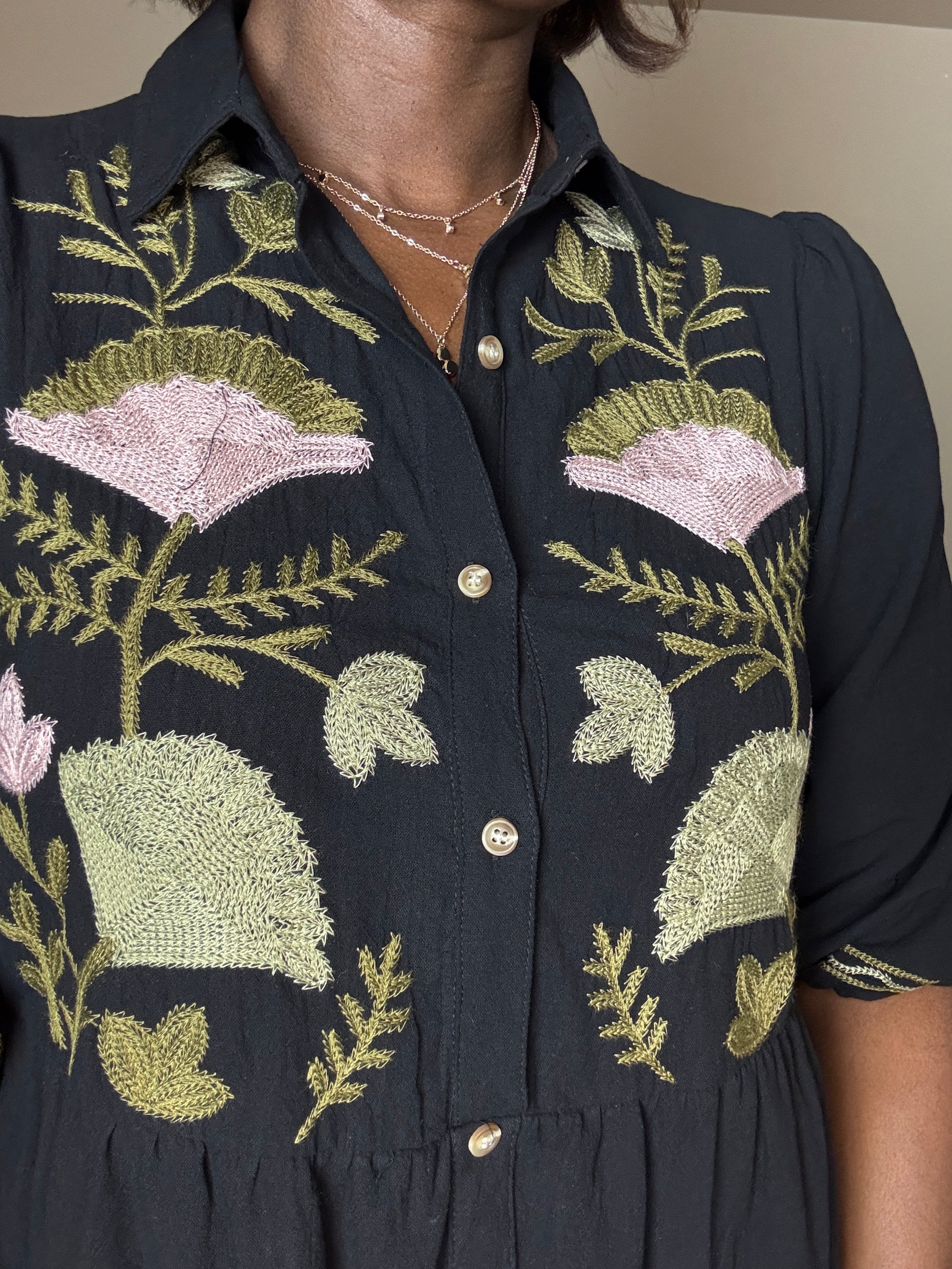 Make a statement with our Embroidered Button-Down Midi Dress, a perfect blend of elegance and comfort. This black midi dress features exquisite floral embroidery in soft pink and green hues, adding a touch of artisanal charm. The classic collared neckline, functional button-down front, and flowy A-line silhouette make it a versatile piece for any occasion.