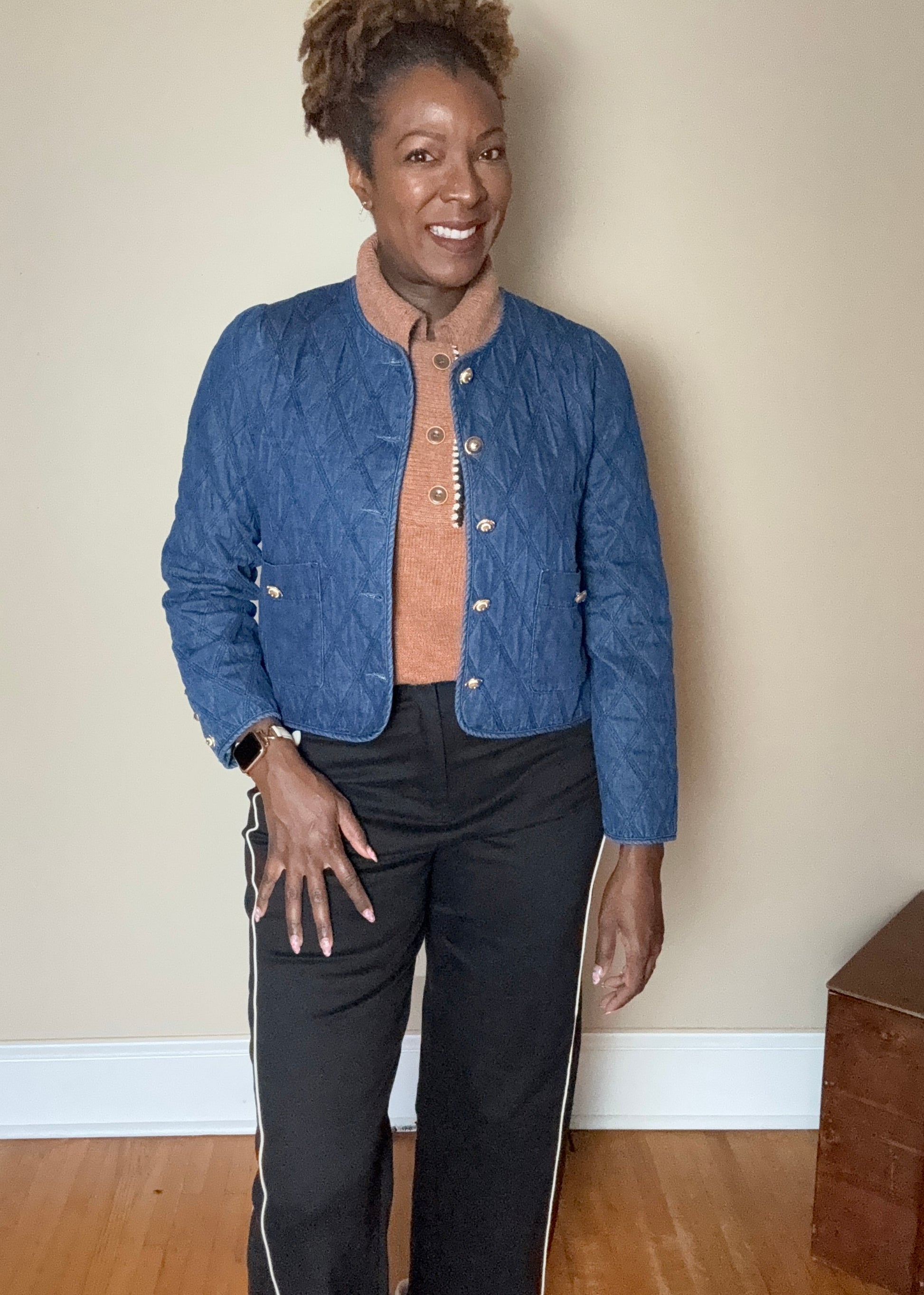 Classic denim gets a chic upgrade in the Austin Quilted Denim Collarless Jacket. Featuring a diamond-quilted texture, antique-style gold buttons, and a clean collarless neckline, this jacket is the perfect balance of casual and polished. Functional front pockets and structured sleeves with button cuffs add utility and style, while the midweight denim makes it a versatile layering piece for fall.