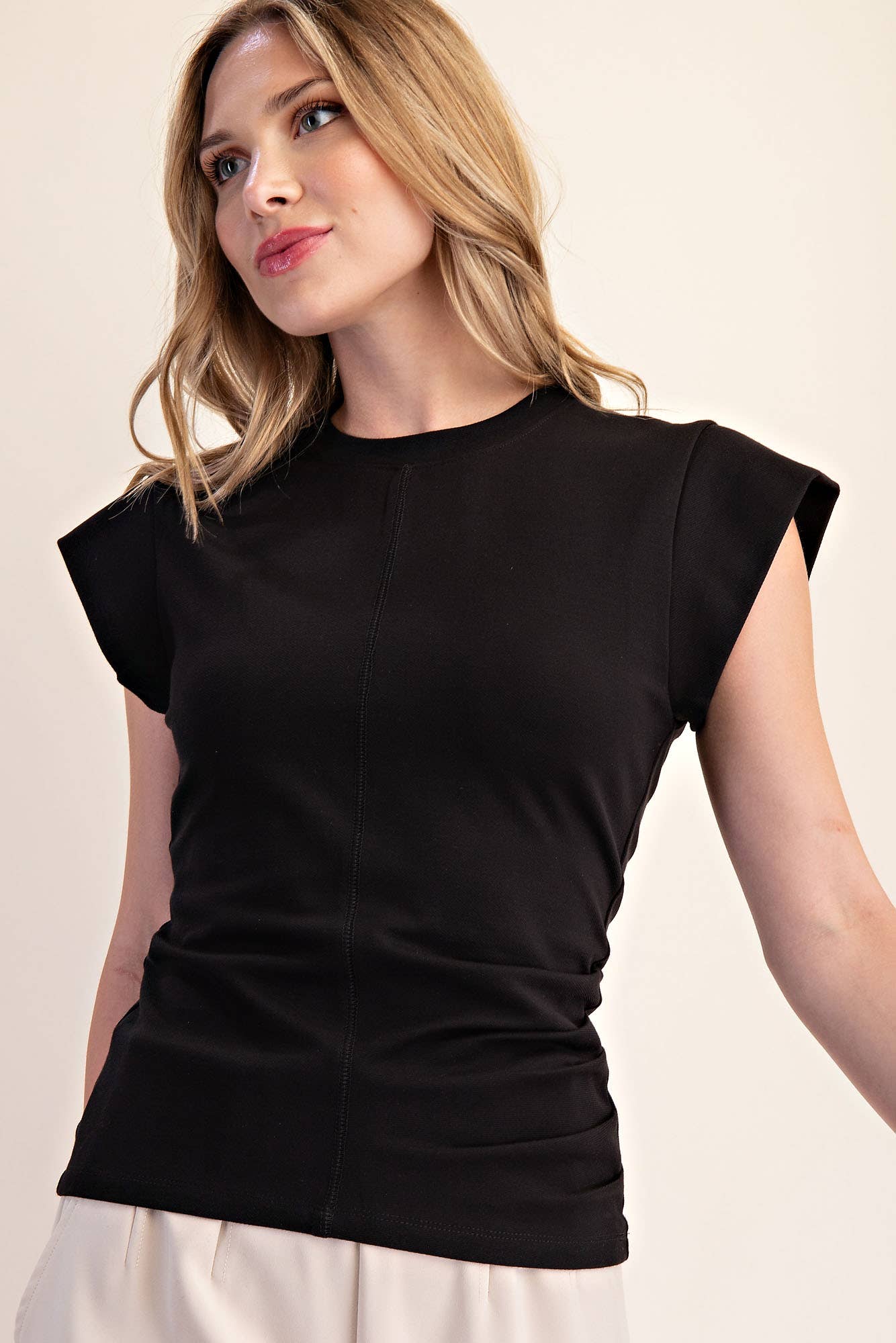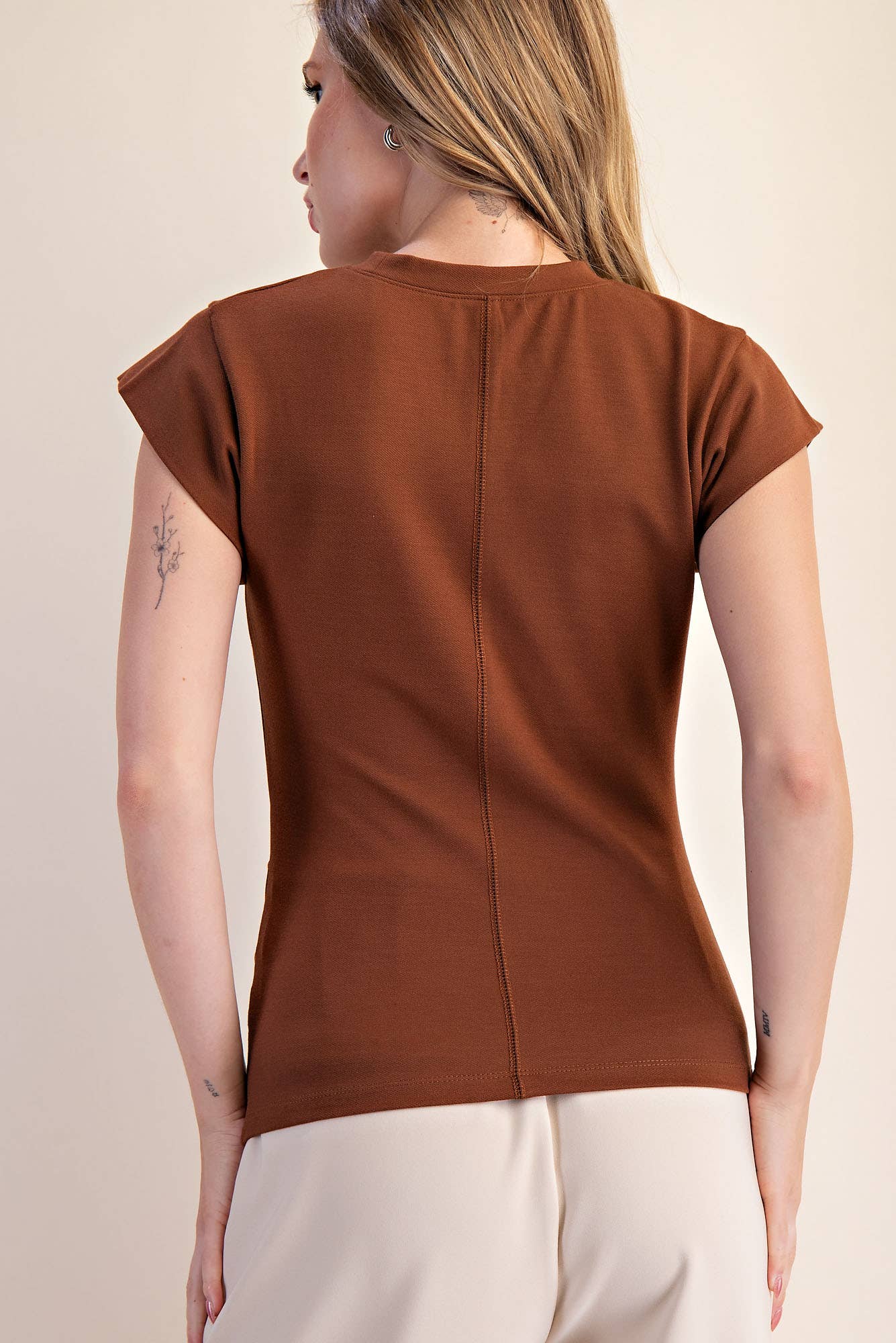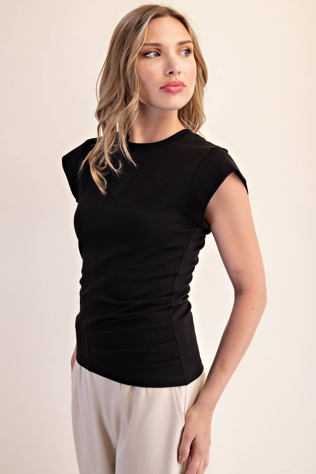 Clean lines, subtle structure, and just the right amount of stretch — the Ceci Structured Cap Sleeve Top is your polished essential for fall. This fitted silhouette features modern cap sleeves and a center seam detail for a sleek, elevated look. Fabric is slightly textured and structured for a fit that holds you in! Perfect for pairing with tailored pants, skirts, or layered under blazers. Fits true to size.