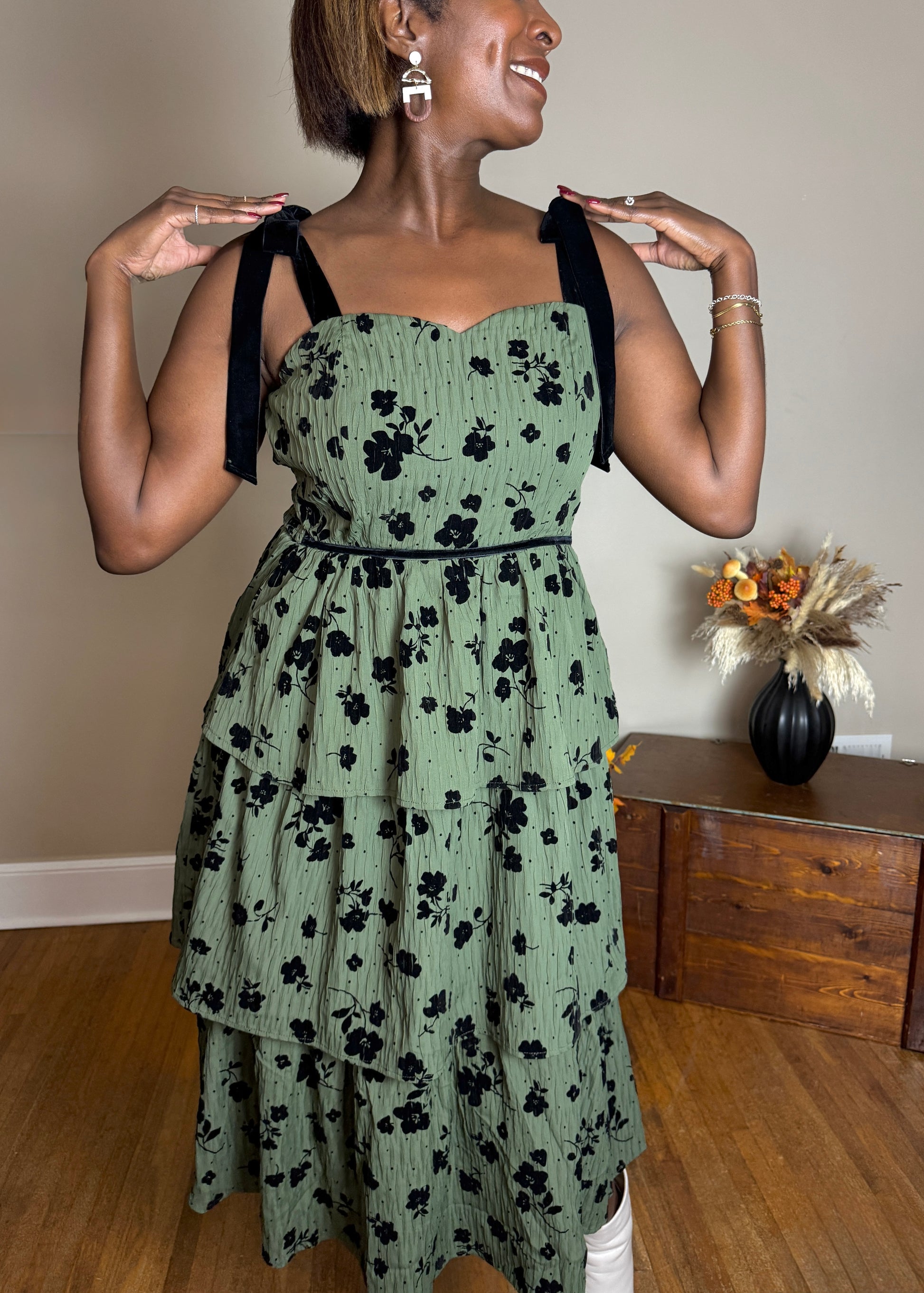 Step into a quiet kind of confidence with the Velvet Bloom Dress — a fall statement that whispers rather than shouts. This tiered midi is kissed with soft, dimensional floral flocking that dances in the light, blending romance with rustic charm.