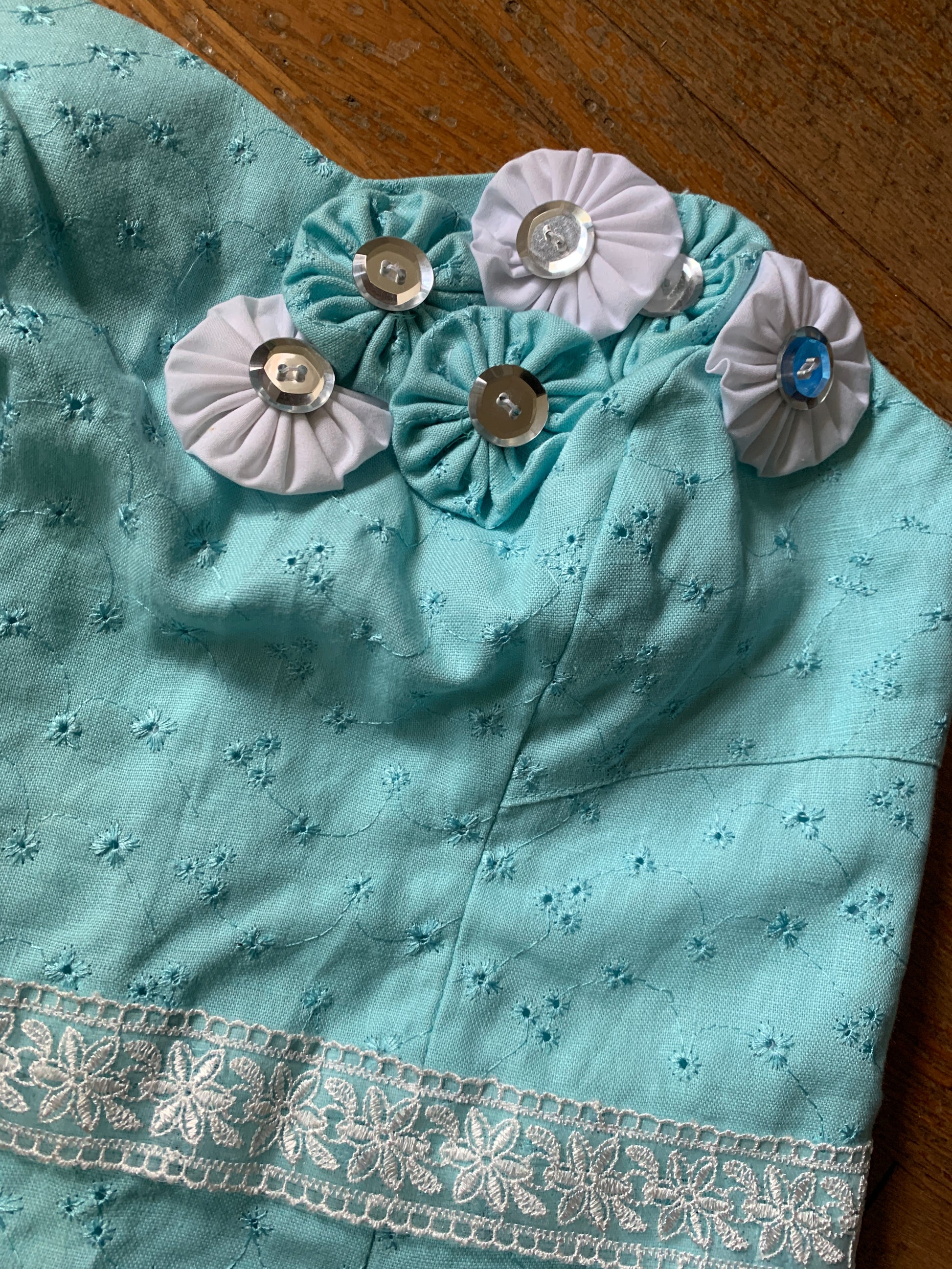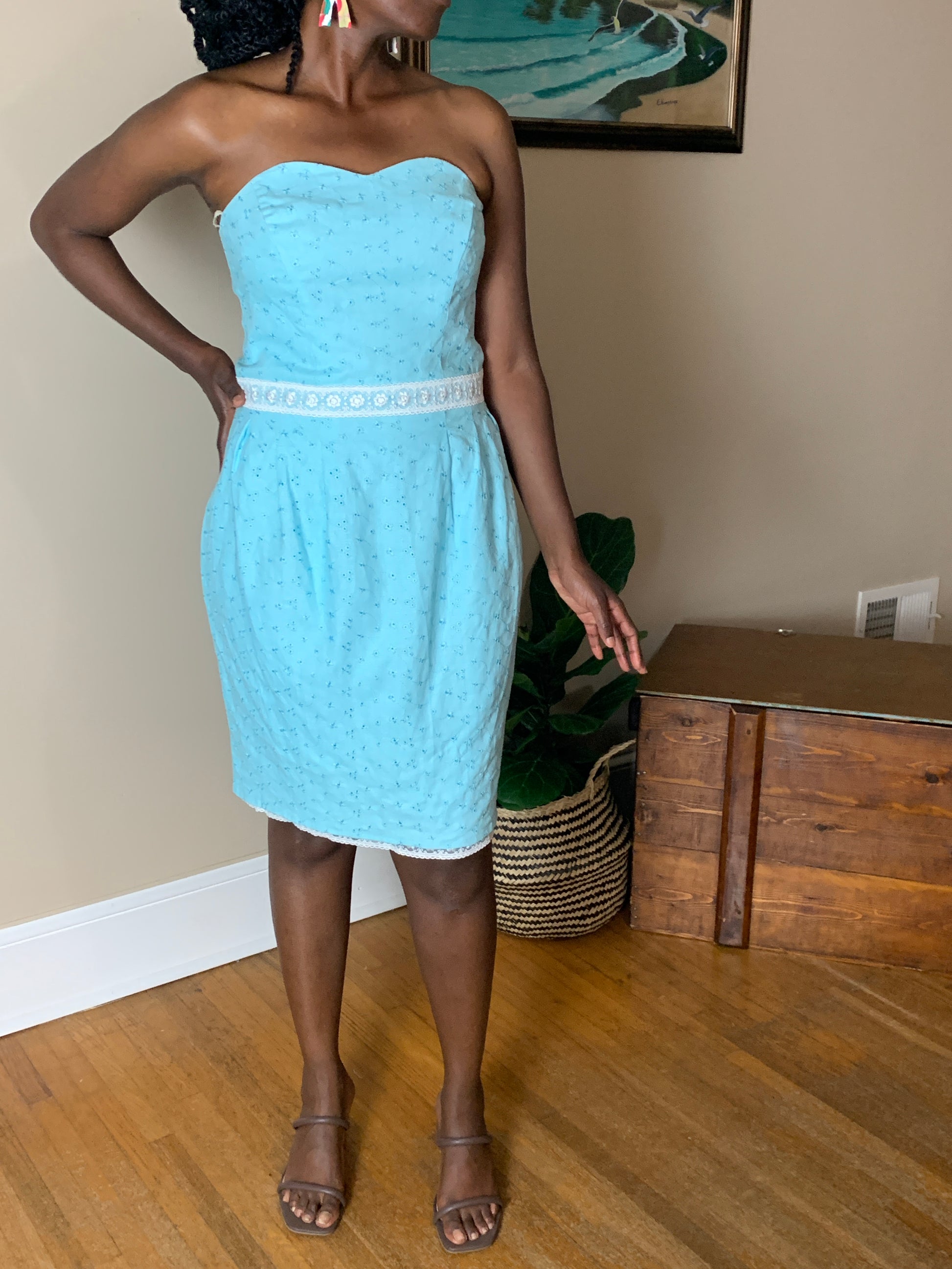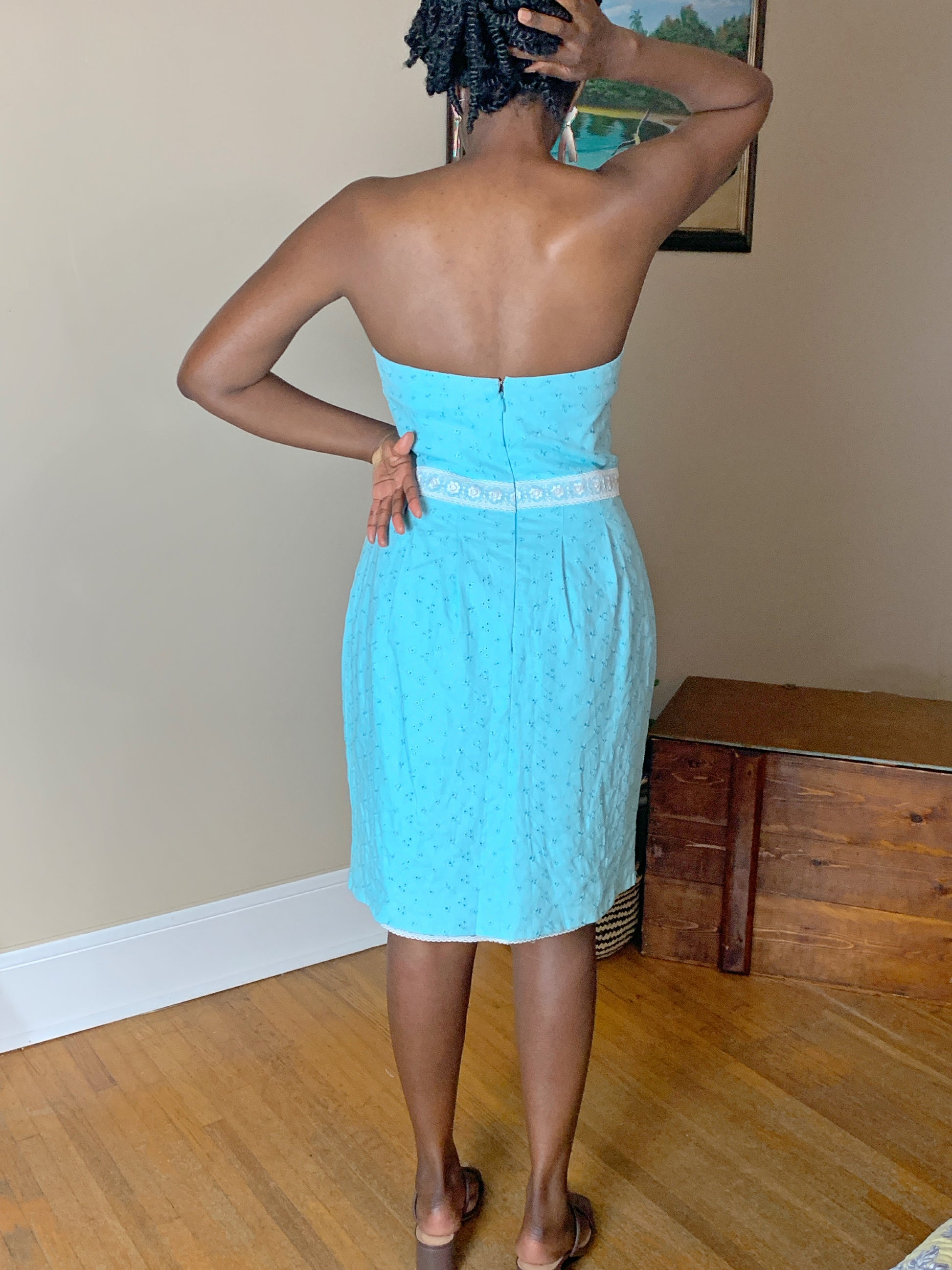 This dress is from our original collection. The dress is fully lined with bonding added to enhance the fit and keep this lovely dress in place. The soft pleats along the waist add a figure flattering touch to the slightly tapered skirt shape.