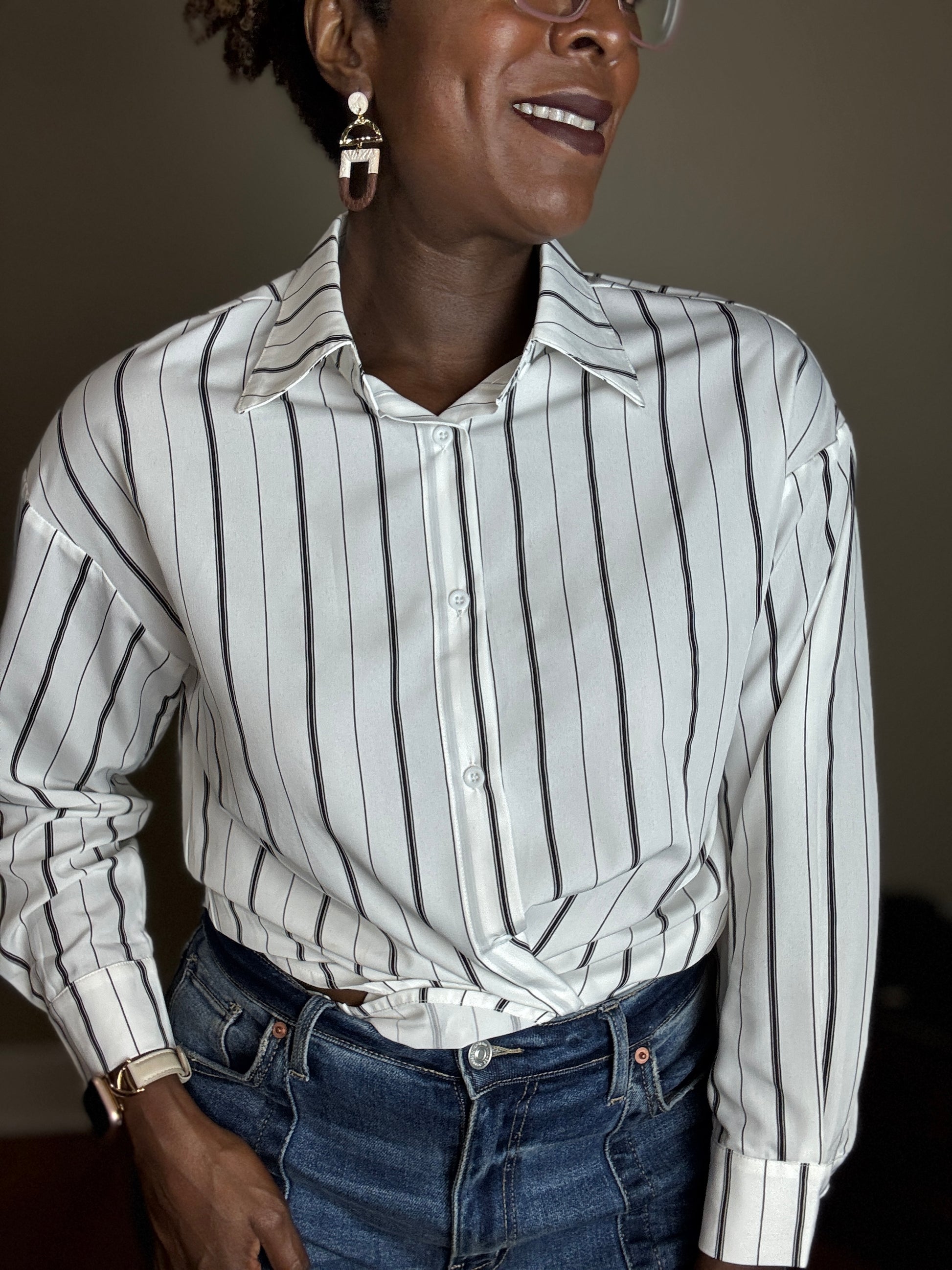Meet Loraine, your new online-exclusive favorite that captures effortless polish with a relaxed edge. This striped button-down shirt features crisp vertical lines that elongate your frame and a soft, flowy drape that moves with you.