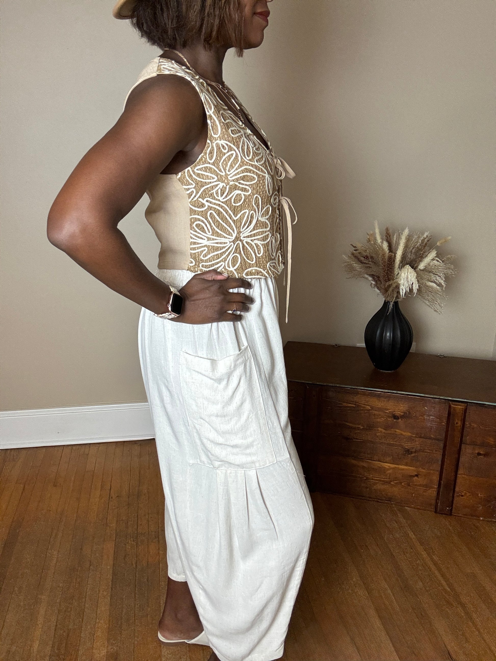 Designed with an elastic waistband for a flexible, pull-on fit and roomy side pockets for a functional touch. The wide leg and cropped length give them a modern, relaxed vibe—perfect for warm days or casual weekends.